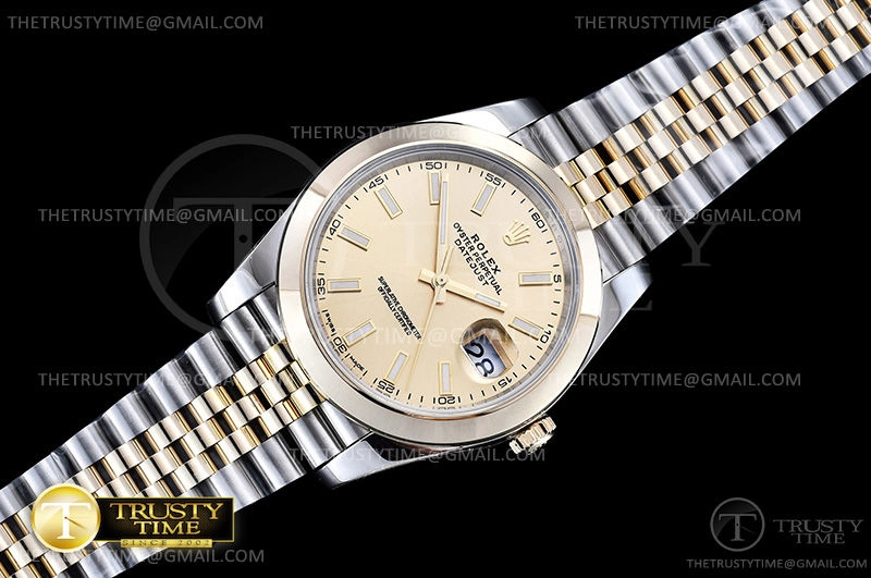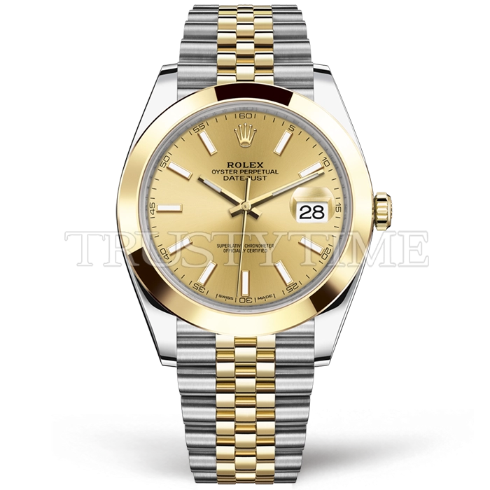 Часы Rolex из коллекции DateJust II. Классические мужские часы Rolex DateJust II 41mm 126303-0010 премиального качества (Артикул магазина: RX-0846) оснащены надежным автоматическим механизмом с автоподзаводом (работает от амплитуды движения руки) калибра 3235, в котором реализованы следующие функции: часовая, минутная и секундная стрелки, а так же дата. Круглый корпус часов комбинированного сталь с желтого золота цвета, имеющий размер 41 мм и высоту 13 мм превосходно дополнит образ и украсит запястье своего обладателя. Для изготовления часов Rolex DateJust II 41mm 126303-0010 предлагаемых в нашем интернет-магазине, применяются нержавеющая сталь 316F высокого качества (Швейцарский стандарт), а так же сапфировое стекло высокой прочности, благодаря чему обеспечивается максимальная защита от сколов и механических повреждений. Отличительной чертой данной модели является золотой циферблат, часовые индексы которого обеспечивают часовые метки. Завершает образ браслет из нержавеющей стали комбинированного сталь с желтым золотом цвета с фирменной раскладывающейся застежкой Rolex. Водонепроницаемость данной модели составляет 30М (WR30) – допускается минимальное воздействие с водой.