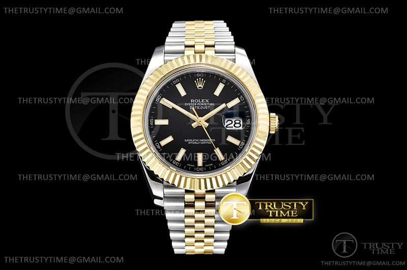 Часы Rolex из коллекции DateJust II. Классические мужские часы Rolex DateJust II 41mm 126333-0014 премиального качества (Артикул магазина: RX-0774) оснащены надежным автоматическим механизмом с автоподзаводом (работает от амплитуды движения руки) калибра 3235, в котором реализованы следующие функции: часовая, минутная и секундная стрелки, а так же дата. Круглый корпус часов комбинированного сталь с желтого золота цвета, имеющий размер 41 мм и высоту 12 мм превосходно дополнит образ и украсит запястье своего обладателя. Для изготовления часов Rolex DateJust II 41mm 126333-0014 предлагаемых в нашем интернет-магазине, применяются нержавеющая сталь 316F высокого качества (Швейцарский стандарт), а так же сапфировое стекло высокой прочности, благодаря чему обеспечивается максимальная защита от сколов и механических повреждений. Отличительной чертой данной модели является черный циферблат, часовые индексы которого обеспечивают часовые метки. Завершает образ браслет из нержавеющей стали комбинированного сталь с желтым золотом цвета с фирменной раскладывающейся застежкой Rolex. Водонепроницаемость данной модели составляет 30М (WR30) – допускается минимальное воздействие с водой.
