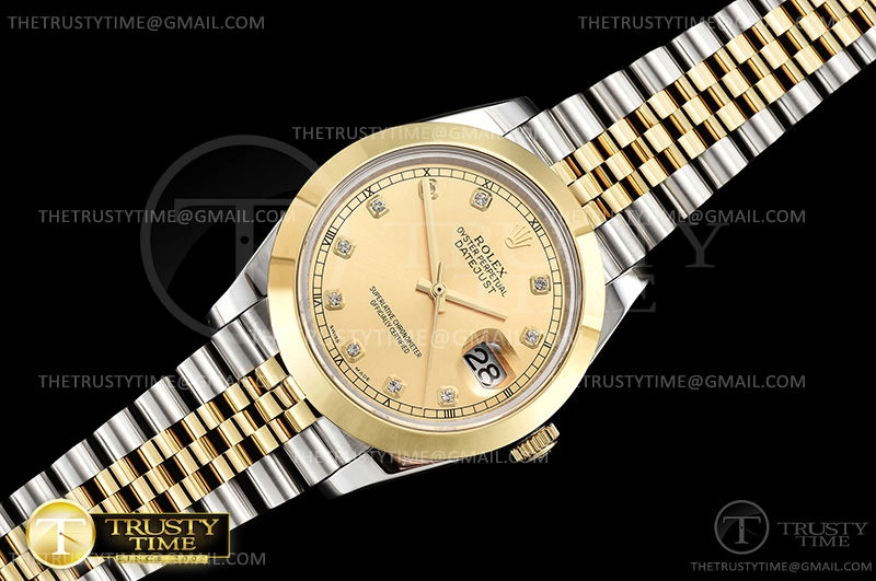 Часы Rolex из коллекции DateJust II. Классические мужские часы Rolex DateJust II 41mm 126303-0012 премиального качества (Артикул магазина: RX-0748) оснащены надежным автоматическим механизмом с автоподзаводом (работает от амплитуды движения руки) калибра 3235, в котором реализованы следующие функции: часовая, минутная и секундная стрелки, а так же дата. Круглый корпус часов комбинированного сталь с желтого золота цвета, имеющий размер 41 мм и высоту 12 мм превосходно дополнит образ и украсит запястье своего обладателя. Для изготовления часов Rolex DateJust II 41mm 126303-0012 предлагаемых в нашем интернет-магазине, применяются нержавеющая сталь 316F высокого качества (Швейцарский стандарт), а так же сапфировое стекло высокой прочности, благодаря чему обеспечивается максимальная защита от сколов и механических повреждений. Отличительной чертой данной модели является золотой циферблат, часовые индексы которого обеспечивают камни. Завершает образ браслет из нержавеющей стали комбинированного сталь с желтым золотом цвета с фирменной раскладывающейся застежкой Rolex. Водонепроницаемость данной модели составляет 30М (WR30) – допускается минимальное воздействие с водой.