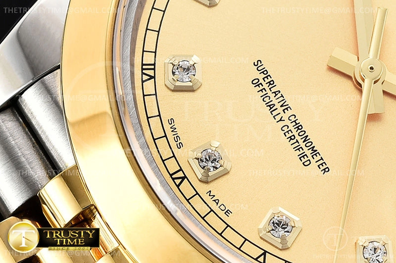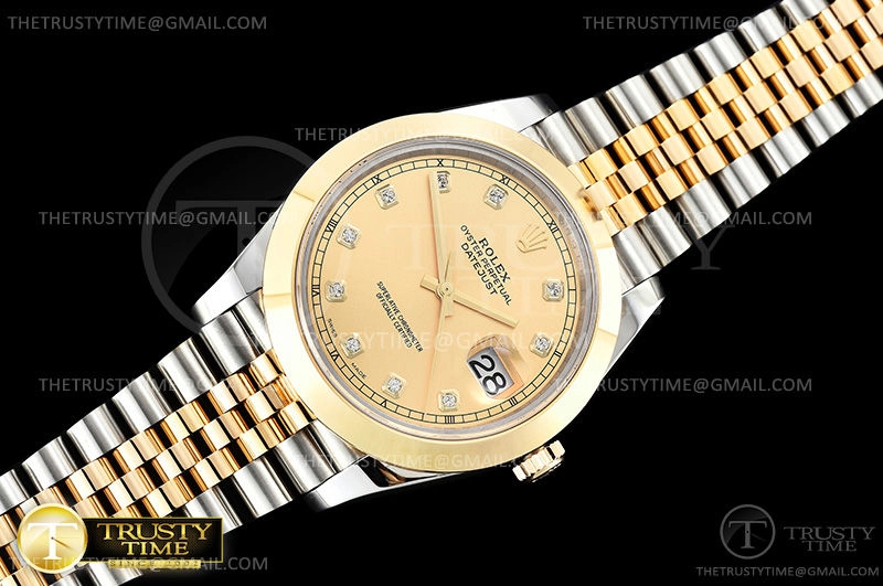 Часы Rolex из коллекции DateJust II. Классические мужские часы Rolex DateJust II 41mm 126303-0012 премиального качества (Артикул магазина: RX-0715) оснащены надежным автоматическим механизмом с автоподзаводом (работает от амплитуды движения руки) калибра 3235, в котором реализованы следующие функции: часовая, минутная и секундная стрелки, а так же дата. Круглый корпус часов комбинированного сталь с желтого золота цвета, имеющий размер 41 мм и высоту 12 мм превосходно дополнит образ и украсит запястье своего обладателя. Для изготовления часов Rolex DateJust II 41mm 126303-0012 предлагаемых в нашем интернет-магазине, применяются нержавеющая сталь 316F высокого качества (Швейцарский стандарт), а так же сапфировое стекло высокой прочности, благодаря чему обеспечивается максимальная защита от сколов и механических повреждений. Отличительной чертой данной модели является золотой циферблат, часовые индексы которого обеспечивают камни. Завершает образ браслет из нержавеющей стали комбинированного сталь с желтым золотом цвета с фирменной раскладывающейся застежкой Rolex. Водонепроницаемость данной модели составляет 30М (WR30) – допускается минимальное воздействие с водой.