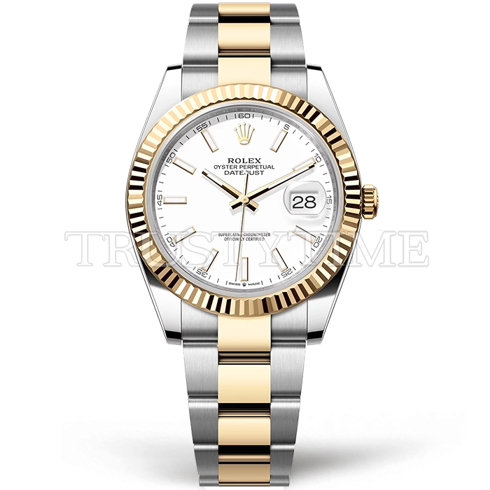 Часы Rolex из коллекции DateJust II. Классические мужские часы Rolex DateJust II 41mm 126333-0015 премиального качества (Артикул магазина: RX-1884) оснащены надежным автоматическим механизмом с автоподзаводом (работает от амплитуды движения руки) калибра 3235, в котором реализованы следующие функции: часовая, минутная и секундная стрелки, а так же дата. Круглый корпус часов комбинированного сталь с желтого золота цвета, имеющий размер 41 мм и высоту 12 мм превосходно дополнит образ и украсит запястье своего обладателя. Для изготовления часов Rolex DateJust II 41mm 126333-0015 предлагаемых в нашем интернет-магазине, применяются нержавеющая сталь 904L высокого качества (Швейцарский стандарт), а так же сапфировое стекло высокой прочности, благодаря чему обеспечивается максимальная защита от сколов и механических повреждений. Отличительной чертой данной модели является белый циферблат, часовые индексы которого обеспечивают часовые метки. Завершает образ браслет из нержавеющей стали комбинированного сталь с желтым золотом цвета с фирменной раскладывающейся застежкой Rolex. Водонепроницаемость данной модели составляет 30М (WR30) – допускается минимальное воздействие с водой.