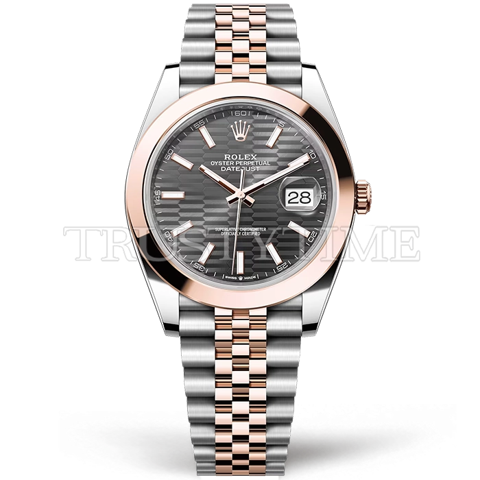 Часы Rolex из коллекции DateJust II. Классические мужские часы Rolex DateJust II 41mm 126301-0020 премиального качества (Артикул магазина: RX-2664) оснащены надежным автоматическим механизмом с автоподзаводом (работает от амплитуды движения руки) калибра 3235, в котором реализованы следующие функции: часовая, минутная и секундная стрелки, а так же дата. Круглый корпус часов комбинированного сталь с розового золота цвета, имеющий размер 41 мм и высоту 12 мм превосходно дополнит образ и украсит запястье своего обладателя. Для изготовления часов Rolex DateJust II 41mm 126301-0020 предлагаемых в нашем интернет-магазине, применяются нержавеющая сталь 904L высокого качества (Швейцарский стандарт), а так же сапфировое стекло высокой прочности, благодаря чему обеспечивается максимальная защита от сколов и механических повреждений. Отличительной чертой данной модели является серый циферблат, часовые индексы которого обеспечивают часовые метки. Завершает образ браслет из нержавеющей стали комбинированного сталь с розовым золотом цвета с фирменной раскладывающейся застежкой Rolex. Водонепроницаемость данной модели составляет 30М (WR30) – допускается минимальное воздействие с водой.
