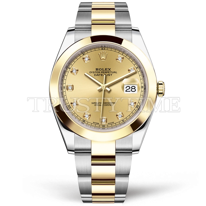 Часы Rolex из коллекции DateJust II. Классические мужские часы Rolex DateJust II 41mm 126303-0011 премиального качества (Артикул магазина: RX-2667) оснащены надежным автоматическим механизмом с автоподзаводом (работает от амплитуды движения руки) калибра 3235, в котором реализованы следующие функции: часовая, минутная и секундная стрелки, а так же дата. Круглый корпус часов комбинированного сталь с желтого золота цвета, имеющий размер 41 мм и высоту 12 мм превосходно дополнит образ и украсит запястье своего обладателя. Для изготовления часов Rolex DateJust II 41mm 126303-0011 предлагаемых в нашем интернет-магазине, применяются нержавеющая сталь 316F высокого качества (Швейцарский стандарт), а так же сапфировое стекло высокой прочности, благодаря чему обеспечивается максимальная защита от сколов и механических повреждений. Отличительной чертой данной модели является золотой циферблат, часовые индексы которого обеспечивают камни. Завершает образ браслет из нержавеющей стали комбинированного сталь с желтым золотом цвета с фирменной раскладывающейся застежкой Rolex. Водонепроницаемость данной модели составляет 30М (WR30) – допускается минимальное воздействие с водой.