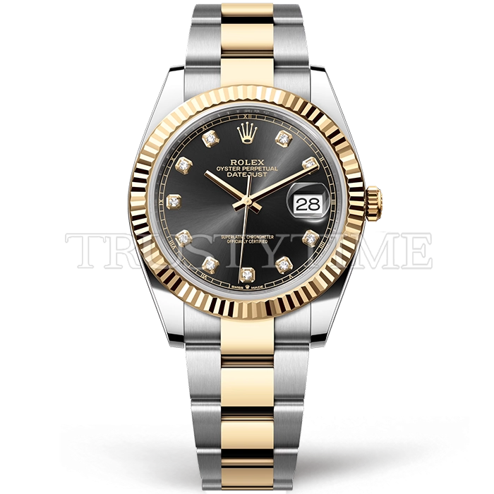 Часы Rolex из коллекции DateJust II. Классические мужские часы Rolex DateJust II 41mm 126333-0005 премиального качества (Артикул магазина: RX-2917) оснащены надежным автоматическим механизмом с автоподзаводом (работает от амплитуды движения руки) калибра 3235, в котором реализованы следующие функции: часовая, минутная и секундная стрелки, а так же дата. Круглый корпус часов комбинированного сталь с желтого золота цвета, имеющий размер 41 мм и высоту 11.7 мм превосходно дополнит образ и украсит запястье своего обладателя. Для изготовления часов Rolex DateJust II 41mm 126333-0005 предлагаемых в нашем интернет-магазине, применяются нержавеющая сталь 904L высокого качества (Швейцарский стандарт), а так же сапфировое стекло высокой прочности, благодаря чему обеспечивается максимальная защита от сколов и механических повреждений. Отличительной чертой данной модели является черный циферблат, часовые индексы которого обеспечивают камни. Завершает образ браслет из нержавеющей стали комбинированного сталь с желтым золотом цвета с фирменной раскладывающейся застежкой Rolex. Водонепроницаемость данной модели составляет 30М (WR30) – допускается минимальное воздействие с водой.