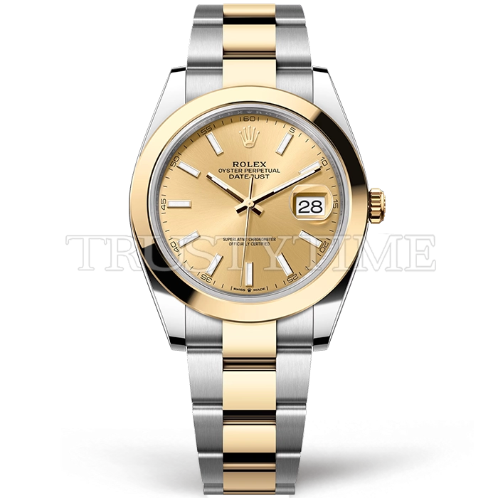 Часы Rolex из коллекции DateJust II. Классические мужские часы Rolex DateJust 41mm 126303-0009 премиального качества (Артикул магазина: RX-2924) оснащены надежным автоматическим механизмом с автоподзаводом (работает от амплитуды движения руки) калибра 3235, в котором реализованы следующие функции: часовая, минутная и секундная стрелки, а так же дата. Круглый корпус часов комбинированного сталь с желтого золота цвета, имеющий размер 41 мм и высоту 12 мм превосходно дополнит образ и украсит запястье своего обладателя. Для изготовления часов Rolex DateJust 41mm 126303-0009 предлагаемых в нашем интернет-магазине, применяются нержавеющая сталь 904L высокого качества (Швейцарский стандарт), а так же сапфировое стекло высокой прочности, благодаря чему обеспечивается максимальная защита от сколов и механических повреждений. Отличительной чертой данной модели является золотой циферблат, часовые индексы которого обеспечивают часовые метки. Завершает образ браслет из нержавеющей стали комбинированного сталь с желтым золотом цвета с фирменной раскладывающейся застежкой Rolex. Водонепроницаемость данной модели составляет 30М (WR30) – допускается минимальное воздействие с водой.