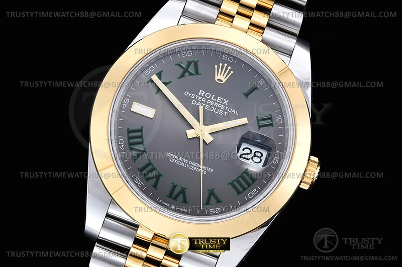 Часы Rolex из коллекции DateJust II. Классические мужские часы Rolex DateJust II 41mm 126303-0020 премиального качества (Артикул магазина: RX-2941) оснащены надежным автоматическим механизмом с автоподзаводом (работает от амплитуды движения руки) калибра 3235, в котором реализованы следующие функции: часовая, минутная и секундная стрелки, а так же дата. Круглый корпус часов комбинированного сталь с желтого золота цвета, имеющий размер 41 мм и высоту 11.6 мм превосходно дополнит образ и украсит запястье своего обладателя. Для изготовления часов Rolex DateJust II 41mm 126303-0020 предлагаемых в нашем интернет-магазине, применяются нержавеющая сталь 316F высокого качества (Швейцарский стандарт), а так же сапфировое стекло высокой прочности, благодаря чему обеспечивается максимальная защита от сколов и механических повреждений. Отличительной чертой данной модели является серый циферблат, часовые индексы которого обеспечивают римские цифры. Завершает образ браслет из нержавеющей стали комбинированного сталь с желтым золотом цвета с фирменной раскладывающейся застежкой Rolex. Водонепроницаемость данной модели составляет 30М (WR30) – допускается минимальное воздействие с водой.