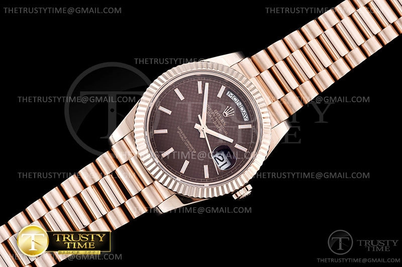 Часы Rolex из коллекции Day-Date. Классические мужские часы Rolex Day-Date 40mm 228235-0006 премиального качества (Артикул магазина: RX-1009) оснащены надежным автоматическим механизмом с автоподзаводом (работает от амплитуды движения руки) калибра 3255, в котором реализованы следующие функции: часовая, минутная и секундная стрелки, а так же дата, день недели. Круглый корпус часов розового цвета, имеющий размер 40 мм и высоту 12 мм превосходно дополнит образ и украсит запястье своего обладателя. Для изготовления часов Rolex Day-Date 40mm 228235-0006 предлагаемых в нашем интернет-магазине, применяются нержавеющая сталь 904 высокого качества (Швейцарский стандарт), а так же сапфировое стекло высокой прочности, благодаря чему обеспечивается максимальная защита от сколов и механических повреждений. Отличительной чертой данной модели является коричневый циферблат, часовые индексы которого обеспечивают часовые метки. Завершает образ браслет из нержавеющей стали цвета розового золота с фирменной раскладывающейся застежкой Rolex. Водонепроницаемость данной модели составляет 30М (WR30) – допускается минимальное воздействие с водой.