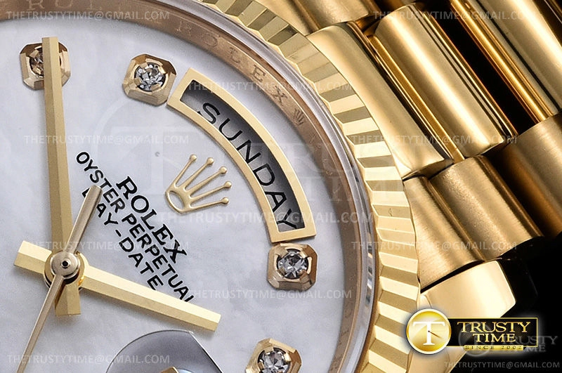 Часы Rolex из коллекции Day-Date. Классические женские часы Rolex Day-Date 36mm 128238-0011 премиального качества (Артикул магазина: RX-0899) оснащены надежным автоматическим механизмом с автоподзаводом (работает от амплитуды движения руки) калибра 3255, в котором реализованы следующие функции: часовая, минутная и секундная стрелки, а так же дата, день недели. Круглый корпус часов цветы желтой золота, имеющий размер 36 мм и высоту 12 мм превосходно дополнит образ и украсит запястье своего обладателя. Для изготовления часов Rolex Day-Date 36mm 128238-0011 предлагаемых в нашем интернет-магазине, применяются нержавеющая сталь 904 высокого качества (Швейцарский стандарт), а так же сапфировое стекло высокой прочности, благодаря чему обеспечивается максимальная защита от сколов и механических повреждений. Отличительной чертой данной модели является перламутровый циферблат, часовые индексы которого обеспечивают камни. Завершает образ браслет из нержавеющей стали цвета желтого золота с фирменной раскладывающейся застежкой Rolex. Водонепроницаемость данной модели составляет 30М (WR30) – допускается минимальное воздействие с водой.
