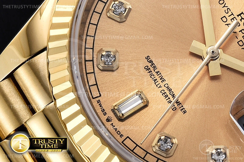 Часы Rolex из коллекции Day-Date. Классические женские часы Rolex Day-Date 36mm 128238-0008 премиального качества (Артикул магазина: RX-0902) оснащены надежным автоматическим механизмом с автоподзаводом (работает от амплитуды движения руки) калибра 3255, в котором реализованы следующие функции: часовая, минутная и секундная стрелки, а так же дата, день недели. Круглый корпус часов цветы желтой золота, имеющий размер 36 мм и высоту 12 мм превосходно дополнит образ и украсит запястье своего обладателя. Для изготовления часов Rolex Day-Date 36mm 128238-0008 предлагаемых в нашем интернет-магазине, применяются нержавеющая сталь 904 высокого качества (Швейцарский стандарт), а так же сапфировое стекло высокой прочности, благодаря чему обеспечивается максимальная защита от сколов и механических повреждений. Отличительной чертой данной модели является золотой циферблат, часовые индексы которого обеспечивают камни. Завершает образ браслет из нержавеющей стали цвета желтого золота с фирменной раскладывающейся застежкой Rolex. Водонепроницаемость данной модели составляет 30М (WR30) – допускается минимальное воздействие с водой.