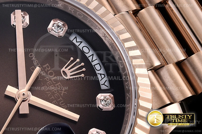 Часы Rolex из коллекции Day-Date. Классические женские часы Rolex Day-Date 36mm 128235-0037 премиального качества (Артикул магазина: RX-0906) оснащены надежным автоматическим механизмом с автоподзаводом (работает от амплитуды движения руки) калибра 3255, в котором реализованы следующие функции: часовая, минутная и секундная стрелки, а так же дата, день недели. Круглый корпус часов розового цвета, имеющий размер 36 мм и высоту 12 мм превосходно дополнит образ и украсит запястье своего обладателя. Для изготовления часов Rolex Day-Date 36mm 128235-0037 предлагаемых в нашем интернет-магазине, применяются нержавеющая сталь 904 высокого качества (Швейцарский стандарт), а так же сапфировое стекло высокой прочности, благодаря чему обеспечивается максимальная защита от сколов и механических повреждений. Отличительной чертой данной модели является коричневый циферблат, часовые индексы которого обеспечивают камни. Завершает образ браслет из нержавеющей стали цвета розового золота с фирменной раскладывающейся застежкой Rolex. Водонепроницаемость данной модели составляет 30М (WR30) – допускается минимальное воздействие с водой.