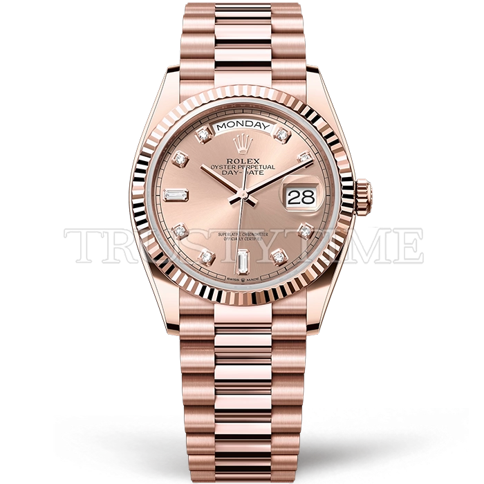 Часы Rolex из коллекции Day-Date. Классические женские часы Rolex Day-Date 36mm 128235-0009 премиального качества (Артикул магазина: RX-0908) оснащены надежным автоматическим механизмом с автоподзаводом (работает от амплитуды движения руки) калибра 3255, в котором реализованы следующие функции: часовая, минутная и секундная стрелки, а так же дата, день недели. Круглый корпус часов розового цвета, имеющий размер 36 мм и высоту 12 мм превосходно дополнит образ и украсит запястье своего обладателя. Для изготовления часов Rolex Day-Date 36mm 128235-0009 предлагаемых в нашем интернет-магазине, применяются нержавеющая сталь 904 высокого качества (Швейцарский стандарт), а так же сапфировое стекло высокой прочности, благодаря чему обеспечивается максимальная защита от сколов и механических повреждений. Отличительной чертой данной модели является золотой циферблат, часовые индексы которого обеспечивают камни. Завершает образ браслет из нержавеющей стали цвета розового золота с фирменной раскладывающейся застежкой Rolex. Водонепроницаемость данной модели составляет 30М (WR30) – допускается минимальное воздействие с водой.