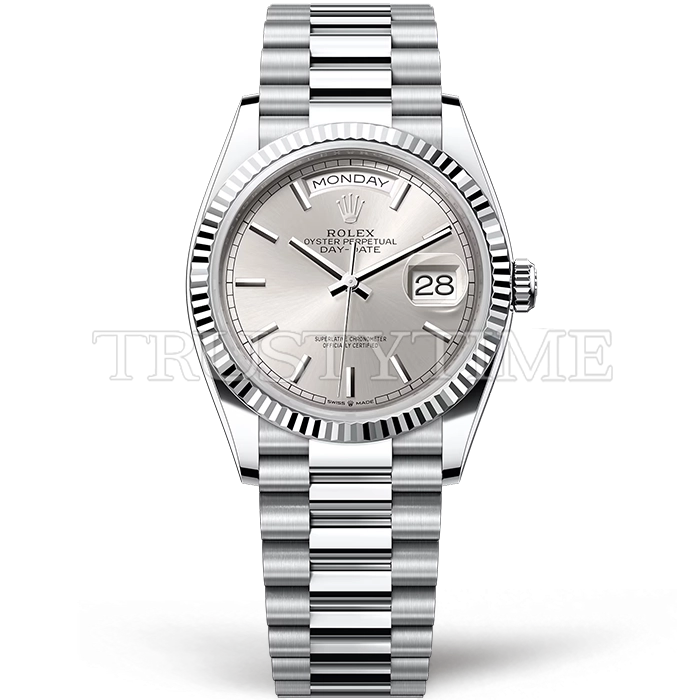 Часы Rolex из коллекции Day-Date. Классические женские часы Rolex Day-Date 36mm 128236-0001 премиального качества (Артикул магазина: RX-0895) оснащены надежным автоматическим механизмом с автоподзаводом (работает от амплитуды движения руки) калибра 3255, в котором реализованы следующие функции: часовая, минутная и секундная стрелки, а так же дата, день недели. Круглый корпус часов стального цвета, имеющий размер 36 мм и высоту 12 мм превосходно дополнит образ и украсит запястье своего обладателя. Для изготовления часов Rolex Day-Date 36mm 128236-0001 предлагаемых в нашем интернет-магазине, применяются нержавеющая сталь 904 высокого качества (Швейцарский стандарт), а так же сапфировое стекло высокой прочности, благодаря чему обеспечивается максимальная защита от сколов и механических повреждений. Отличительной чертой данной модели является серебристый циферблат, часовые индексы которого обеспечивают часовые метки. Завершает образ браслет из нержавеющей стали стального цвета с фирменной раскладывающейся застежкой Rolex. Водонепроницаемость данной модели составляет 30М (WR30) – допускается минимальное воздействие с водой.