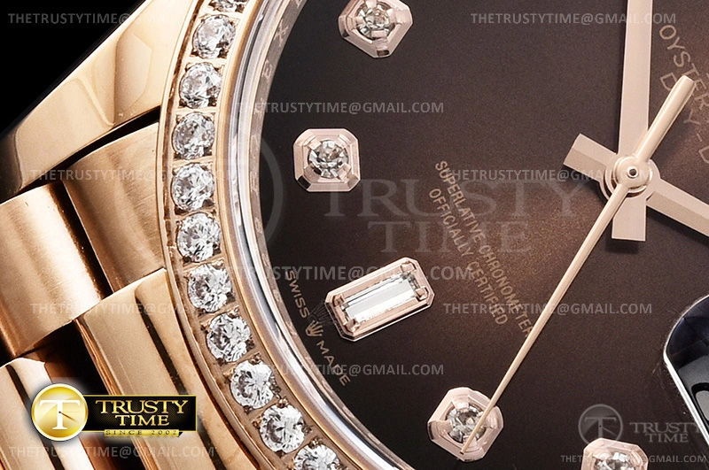 Часы Rolex из коллекции Day-Date. Классические женские часы Rolex Day-Date 36mm 128345RBR-0040 премиального качества (Артикул магазина: RX-1047) оснащены надежным автоматическим механизмом с автоподзаводом (работает от амплитуды движения руки) калибра 3255, в котором реализованы следующие функции: часовая, минутная и секундная стрелки, а так же дата, день недели. Круглый корпус часов розового цвета, имеющий размер 36 мм и высоту 12 мм превосходно дополнит образ и украсит запястье своего обладателя. Для изготовления часов Rolex Day-Date 36mm 128345RBR-0040 предлагаемых в нашем интернет-магазине, применяются нержавеющая сталь 904 высокого качества (Швейцарский стандарт), а так же сапфировое стекло высокой прочности, благодаря чему обеспечивается максимальная защита от сколов и механических повреждений. Отличительной чертой данной модели является коричневый циферблат, часовые индексы которого обеспечивают камни. Завершает образ браслет из нержавеющей стали цвета розового золота с фирменной раскладывающейся застежкой Rolex. Водонепроницаемость данной модели составляет 30М (WR30) – допускается минимальное воздействие с водой.