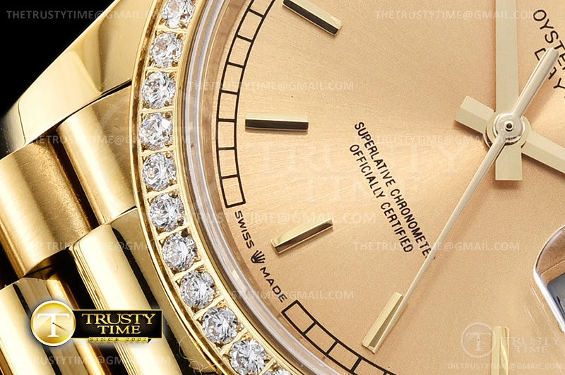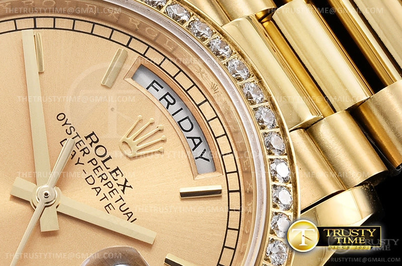 Часы Rolex из коллекции Day-Date. Классические женские часы Rolex Day-Date 36mm 128348RBR-0026 премиального качества (Артикул магазина: RX-1613) оснащены надежным автоматическим механизмом с автоподзаводом (работает от амплитуды движения руки) калибра 3255, в котором реализованы следующие функции: часовая, минутная и секундная стрелки, а так же дата. Круглый корпус часов цветы желтой золота, имеющий размер 36 мм и высоту 12 мм превосходно дополнит образ и украсит запястье своего обладателя. Для изготовления часов Rolex Day-Date 36mm 128348RBR-0026 предлагаемых в нашем интернет-магазине, применяются нержавеющая сталь 904 высокого качества (Швейцарский стандарт), а так же сапфировое стекло высокой прочности, благодаря чему обеспечивается максимальная защита от сколов и механических повреждений. Отличительной чертой данной модели является золотой циферблат, часовые индексы которого обеспечивают часовые метки. Завершает образ браслет из нержавеющей стали цвета желтого золота с фирменной раскладывающейся застежкой Rolex. Водонепроницаемость данной модели составляет 30М (WR30) – допускается минимальное воздействие с водой.