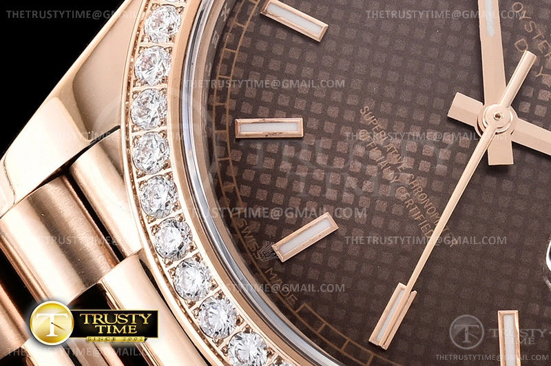 Часы Rolex из коллекции Day-Date. Классические мужские, женские часы Rolex Day-Date 40mm 228345RBR-0005 премиального качества (Артикул магазина: RX-1632) оснащены надежным автоматическим механизмом с автоподзаводом (работает от амплитуды движения руки) калибра 3255, в котором реализованы следующие функции: часовая, минутная и секундная стрелки, а так же дата, день недели. Круглый корпус часов розового цвета, имеющий размер 40 мм и высоту 12 мм превосходно дополнит образ и украсит запястье своего обладателя. Для изготовления часов Rolex Day-Date 40mm 228345RBR-0005 предлагаемых в нашем интернет-магазине, применяются нержавеющая сталь 904 высокого качества (Швейцарский стандарт), а так же сапфировое стекло высокой прочности, благодаря чему обеспечивается максимальная защита от сколов и механических повреждений. Отличительной чертой данной модели является коричневый циферблат, часовые индексы которого обеспечивают часовые метки. Завершает образ браслет из нержавеющей стали цвета розового золота с фирменной раскладывающейся застежкой Rolex. Водонепроницаемость данной модели составляет 30М (WR30) – допускается минимальное воздействие с водой.