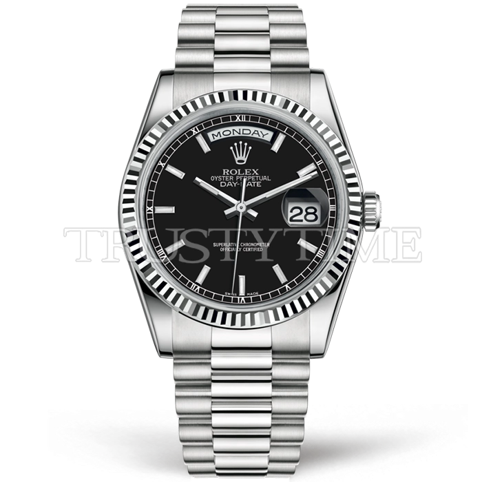 Часы Rolex из коллекции Day-Date. Классические женские часы Rolex Day-Date 36mm 118239-0090 премиального качества (Артикул магазина: RX-1639) оснащены надежным автоматическим механизмом с автоподзаводом (работает от амплитуды движения руки) калибра 3255, в котором реализованы следующие функции: часовая, минутная и секундная стрелки, а так же дата, день недели. Круглый корпус часов стального цвета, имеющий размер 36 мм и высоту 12 мм превосходно дополнит образ и украсит запястье своего обладателя. Для изготовления часов Rolex Day-Date 36mm 118239-0090 предлагаемых в нашем интернет-магазине, применяются нержавеющая сталь 904 высокого качества (Швейцарский стандарт), а так же сапфировое стекло высокой прочности, благодаря чему обеспечивается максимальная защита от сколов и механических повреждений. Отличительной чертой данной модели является черный циферблат, часовые индексы которого обеспечивают часовые метки. Завершает образ браслет из нержавеющей стали стального цвета с фирменной раскладывающейся застежкой Rolex. Водонепроницаемость данной модели составляет 30М (WR30) – допускается минимальное воздействие с водой.