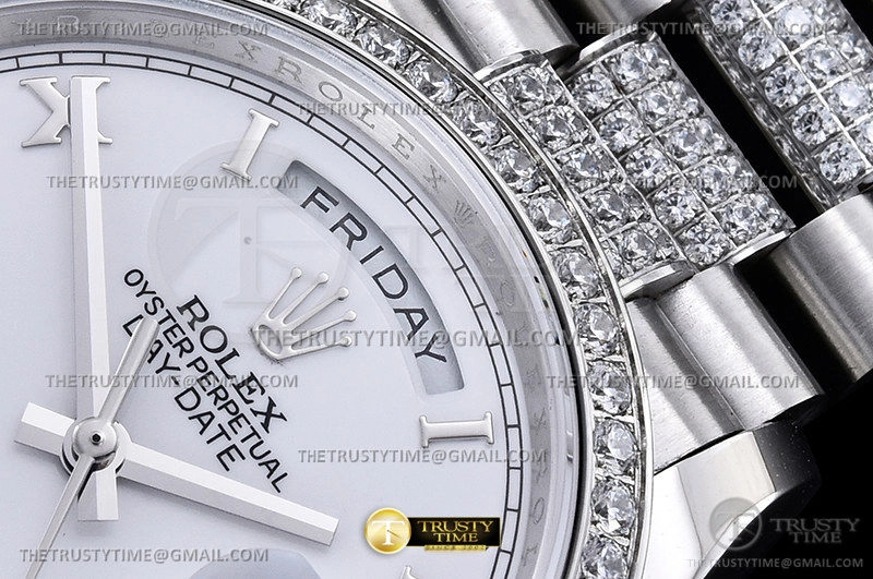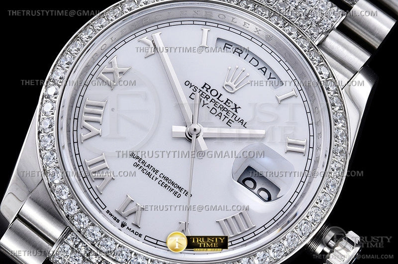Часы Rolex из коллекции Day-Date. Классические женские часы Rolex Day-Date 36mm 128349RBR-0026 премиального качества (Артикул магазина: RX-1976) оснащены надежным автоматическим механизмом с автоподзаводом (работает от амплитуды движения руки) калибра 3255, в котором реализованы следующие функции: часовая, минутная и секундная стрелки, а так же дата, день недели. Круглый корпус часов стального цвета, имеющий размер 36 мм и высоту 12 мм превосходно дополнит образ и украсит запястье своего обладателя. Для изготовления часов Rolex Day-Date 36mm 128349RBR-0026 предлагаемых в нашем интернет-магазине, применяются нержавеющая сталь 904 высокого качества (Швейцарский стандарт), а так же сапфировое стекло высокой прочности, благодаря чему обеспечивается максимальная защита от сколов и механических повреждений. Отличительной чертой данной модели является белый циферблат, часовые индексы которого обеспечивают римские цифры. Завершает образ браслет из нержавеющей стали стального цвета с фирменной раскладывающейся застежкой Rolex. Водонепроницаемость данной модели составляет 30М (WR30) – допускается минимальное воздействие с водой.