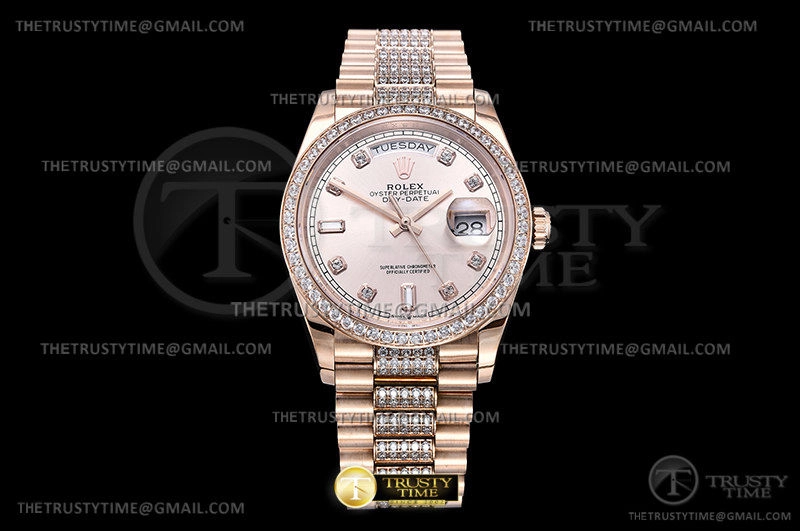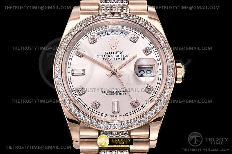 Часы Rolex из коллекции Day-Date. Классические женские часы Rolex Day-Date 36mm 128345RBR-0020 премиального качества (Артикул магазина: RX-1982) оснащены надежным автоматическим механизмом с автоподзаводом (работает от амплитуды движения руки) калибра 3255, в котором реализованы следующие функции: часовая, минутная и секундная стрелки, а так же дата, день недели. Круглый корпус часов розового цвета, имеющий размер 36 мм и высоту 12 мм превосходно дополнит образ и украсит запястье своего обладателя. Для изготовления часов Rolex Day-Date 36mm 128345RBR-0020 предлагаемых в нашем интернет-магазине, применяются нержавеющая сталь 904 высокого качества (Швейцарский стандарт), а так же сапфировое стекло высокой прочности, благодаря чему обеспечивается максимальная защита от сколов и механических повреждений. Отличительной чертой данной модели является золотой циферблат, часовые индексы которого обеспечивают камни. Завершает образ браслет из нержавеющей стали цвета розового золота с фирменной раскладывающейся застежкой Rolex. Водонепроницаемость данной модели составляет 30М (WR30) – допускается минимальное воздействие с водой.