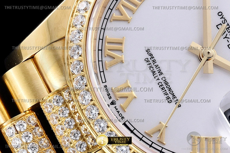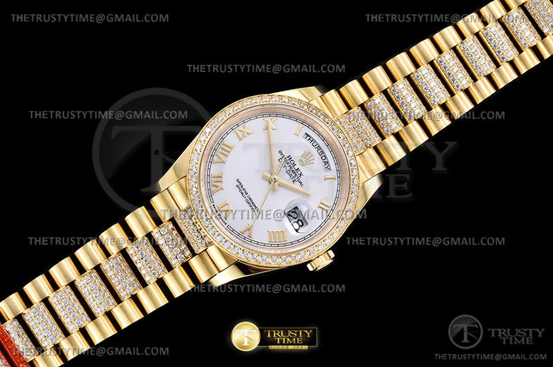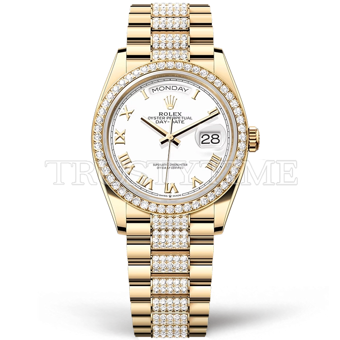 Часы Rolex из коллекции Day-Date. Классические женские часы Rolex Day-Date 36mm 128348RBR-0043 премиального качества (Артикул магазина: RX-1983) оснащены надежным автоматическим механизмом с автоподзаводом (работает от амплитуды движения руки) калибра 3255, в котором реализованы следующие функции: часовая, минутная и секундная стрелки, а так же дата, день недели. Круглый корпус часов цветы желтой золота, имеющий размер 36 мм и высоту 12 мм превосходно дополнит образ и украсит запястье своего обладателя. Для изготовления часов Rolex Day-Date 36mm 128348RBR-0043 предлагаемых в нашем интернет-магазине, применяются нержавеющая сталь 904 высокого качества (Швейцарский стандарт), а так же сапфировое стекло высокой прочности, благодаря чему обеспечивается максимальная защита от сколов и механических повреждений. Отличительной чертой данной модели является белый циферблат, часовые индексы которого обеспечивают римские цифры. Завершает образ браслет из нержавеющей стали цвета желтого золота с фирменной раскладывающейся застежкой Rolex. Водонепроницаемость данной модели составляет 30М (WR30) – допускается минимальное воздействие с водой.