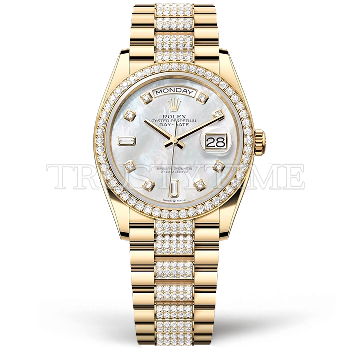 Часы Rolex из коллекции Day-Date. Классические женские часы Rolex Day-Date 36mm 128348RBR-0019 премиального качества (Артикул магазина: RX-1986) оснащены надежным автоматическим механизмом с автоподзаводом (работает от амплитуды движения руки) калибра 3255, в котором реализованы следующие функции: часовая, минутная и секундная стрелки, а так же дата, день недели. Круглый корпус часов цветы желтой золота, имеющий размер 36 мм и высоту 12 мм превосходно дополнит образ и украсит запястье своего обладателя. Для изготовления часов Rolex Day-Date 36mm 128348RBR-0019 предлагаемых в нашем интернет-магазине, применяются нержавеющая сталь 904 высокого качества (Швейцарский стандарт), а так же сапфировое стекло высокой прочности, благодаря чему обеспечивается максимальная защита от сколов и механических повреждений. Отличительной чертой данной модели является перламутровый циферблат, часовые индексы которого обеспечивают камни. Завершает образ браслет из нержавеющей стали цвета желтого золота с фирменной раскладывающейся застежкой Rolex. Водонепроницаемость данной модели составляет 30М (WR30) – допускается минимальное воздействие с водой.