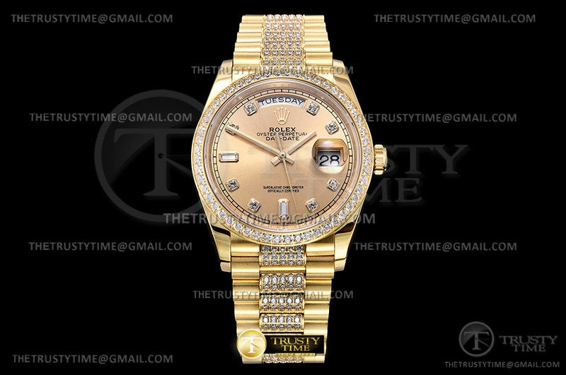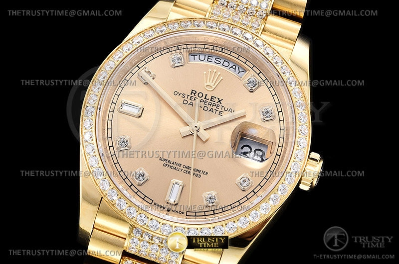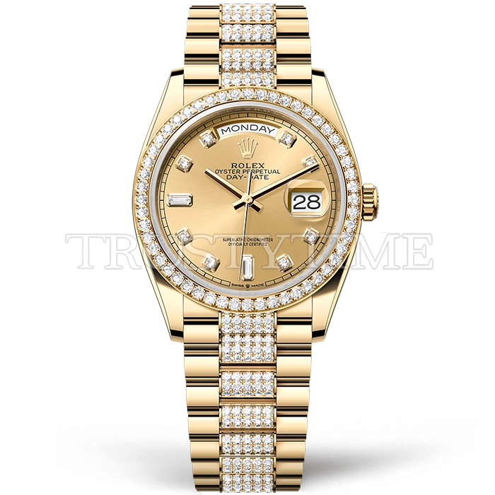 Часы Rolex из коллекции Day-Date. Классические женские часы Rolex Day-Date 36mm 128348RBR-0010 премиального качества (Артикул магазина: RX-1987) оснащены надежным автоматическим механизмом с автоподзаводом (работает от амплитуды движения руки) калибра 3255, в котором реализованы следующие функции: часовая, минутная и секундная стрелки, а так же дата, день недели. Круглый корпус часов цветы желтой золота, имеющий размер 36 мм и высоту 12 мм превосходно дополнит образ и украсит запястье своего обладателя. Для изготовления часов Rolex Day-Date 36mm 128348RBR-0010 предлагаемых в нашем интернет-магазине, применяются нержавеющая сталь 904 высокого качества (Швейцарский стандарт), а так же сапфировое стекло высокой прочности, благодаря чему обеспечивается максимальная защита от сколов и механических повреждений. Отличительной чертой данной модели является золотой циферблат, часовые индексы которого обеспечивают камни. Завершает образ браслет из нержавеющей стали цвета желтого золота с фирменной раскладывающейся застежкой Rolex. Водонепроницаемость данной модели составляет 30М (WR30) – допускается минимальное воздействие с водой.
