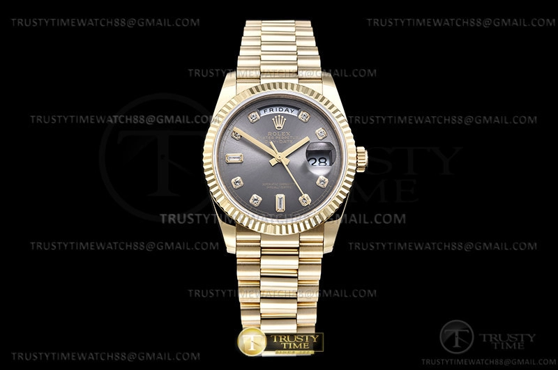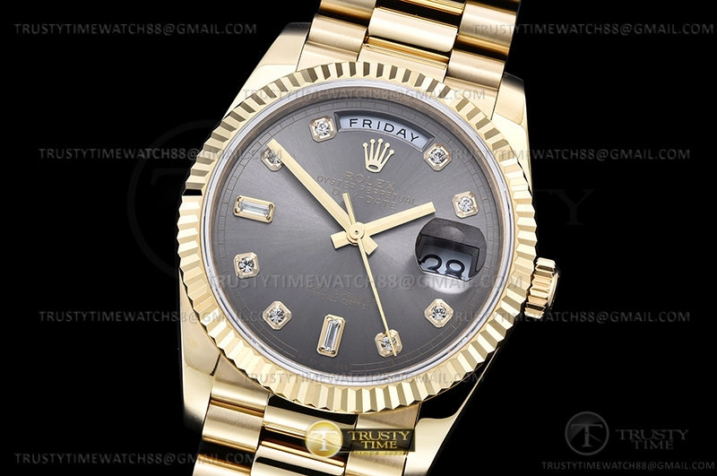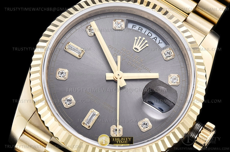 Часы Rolex из коллекции Day-Date. Классические женские часы Rolex Day-Date 36mm 128238-0022 премиального качества (Артикул магазина: RX-1792) оснащены надежным автоматическим механизмом с автоподзаводом (работает от амплитуды движения руки) калибра 3255, в котором реализованы следующие функции: часовая, минутная и секундная стрелки, а так же дата, день недели. Круглый корпус часов цветы желтой золота, имеющий размер 36 мм и высоту 12 мм превосходно дополнит образ и украсит запястье своего обладателя. Для изготовления часов Rolex Day-Date 36mm 128238-0022 предлагаемых в нашем интернет-магазине, применяются нержавеющая сталь 904 высокого качества (Швейцарский стандарт), а так же сапфировое стекло высокой прочности, благодаря чему обеспечивается максимальная защита от сколов и механических повреждений. Отличительной чертой данной модели является серый циферблат, часовые индексы которого обеспечивают камни. Завершает образ браслет из нержавеющей стали цвета желтого золота с фирменной раскладывающейся застежкой Rolex. Водонепроницаемость данной модели составляет 30М (WR30) – допускается минимальное воздействие с водой.