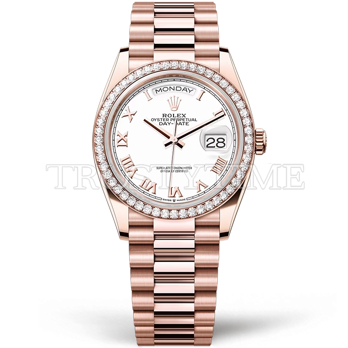 Часы Rolex из коллекции Day-Date. Классические женские часы Rolex Day-Date 36mm 128345RBR-0054 премиального качества (Артикул магазина: RX-2724) оснащены надежным автоматическим механизмом с автоподзаводом (работает от амплитуды движения руки) калибра 3255, в котором реализованы следующие функции: часовая, минутная и секундная стрелки, а так же дата, день недели. Круглый корпус часов розового цвета, имеющий размер 36 мм и высоту 12 мм превосходно дополнит образ и украсит запястье своего обладателя. Для изготовления часов Rolex Day-Date 36mm 128345RBR-0054 предлагаемых в нашем интернет-магазине, применяются нержавеющая сталь 904 высокого качества (Швейцарский стандарт), а так же сапфировое стекло высокой прочности, благодаря чему обеспечивается максимальная защита от сколов и механических повреждений. Отличительной чертой данной модели является белый циферблат, часовые индексы которого обеспечивают римские цифры. Завершает образ браслет из нержавеющей стали цвета розового золота с фирменной раскладывающейся застежкой Rolex. Водонепроницаемость данной модели составляет 30М (WR30) – допускается минимальное воздействие с водой.
