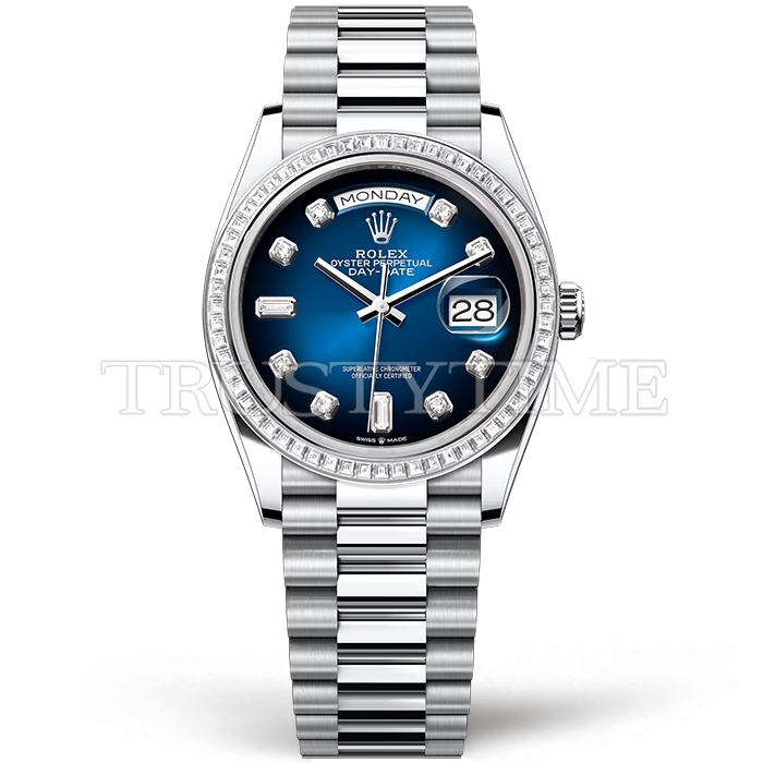Часы Rolex из коллекции Day-Date. Классические женские часы Rolex Day-Date 36mm 128396TBR-0008 премиального качества (Артикул магазина: RX-3329) оснащены надежным автоматическим механизмом с автоподзаводом (работает от амплитуды движения руки) калибра 3255, в котором реализованы следующие функции: часовая, минутная и секундная стрелки, а так же дата, день недели. Круглый корпус часов стального цвета, имеющий размер 36 мм и высоту 12 мм превосходно дополнит образ и украсит запястье своего обладателя. Для изготовления часов Rolex Day-Date 36mm 128396TBR-0008 предлагаемых в нашем интернет-магазине, применяются нержавеющая сталь 904 высокого качества (Швейцарский стандарт), а так же сапфировое стекло высокой прочности, благодаря чему обеспечивается максимальная защита от сколов и механических повреждений. Отличительной чертой данной модели является синий циферблат, часовые индексы которого обеспечивают камни. Завершает образ браслет из нержавеющей стали стального цвета с фирменной раскладывающейся застежкой Rolex. Водонепроницаемость данной модели составляет 30М (WR30) – допускается минимальное воздействие с водой.