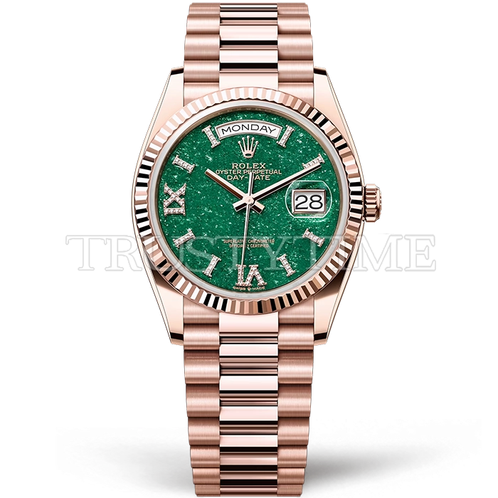 Часы Rolex из коллекции Day-Date. Классические женские часы Rolex Day-Date 36mm 128235-0068 премиального качества (Артикул магазина: RX-3338) оснащены надежным автоматическим механизмом с автоподзаводом (работает от амплитуды движения руки) калибра 3255, в котором реализованы следующие функции: часовая, минутная и секундная стрелки, а так же дата, день недели. Круглый корпус часов розового цвета, имеющий размер 36 мм и высоту 12 мм превосходно дополнит образ и украсит запястье своего обладателя. Для изготовления часов Rolex Day-Date 36mm 128235-0068 предлагаемых в нашем интернет-магазине, применяются нержавеющая сталь 904 высокого качества (Швейцарский стандарт), а так же сапфировое стекло высокой прочности, благодаря чему обеспечивается максимальная защита от сколов и механических повреждений. Отличительной чертой данной модели является зеленый циферблат, часовые индексы которого обеспечивают римские цифры. Завершает образ браслет из нержавеющей стали цвета розового золота с фирменной раскладывающейся застежкой Rolex. Водонепроницаемость данной модели составляет 30М (WR30) – допускается минимальное воздействие с водой.