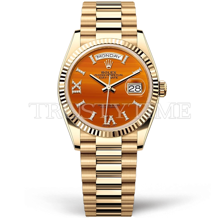 Часы Rolex из коллекции Day-Date. Классические женские часы Rolex Day-Date 36mm 128238-0088 премиального качества (Артикул магазина: RX-3350) оснащены надежным автоматическим механизмом с автоподзаводом (работает от амплитуды движения руки) калибра 3255, в котором реализованы следующие функции: часовая, минутная и секундная стрелки, а так же дата, день недели. Круглый корпус часов цветы желтой золота, имеющий размер 36 мм и высоту 12 мм превосходно дополнит образ и украсит запястье своего обладателя. Для изготовления часов Rolex Day-Date 36mm 128238-0088 предлагаемых в нашем интернет-магазине, применяются нержавеющая сталь 904 высокого качества (Швейцарский стандарт), а так же сапфировое стекло высокой прочности, благодаря чему обеспечивается максимальная защита от сколов и механических повреждений. Отличительной чертой данной модели является оранжевый циферблат, часовые индексы которого обеспечивают римские цифры. Завершает образ браслет из нержавеющей стали цвета желтого золота с фирменной раскладывающейся застежкой Rolex. Водонепроницаемость данной модели составляет 30М (WR30) – допускается минимальное воздействие с водой.