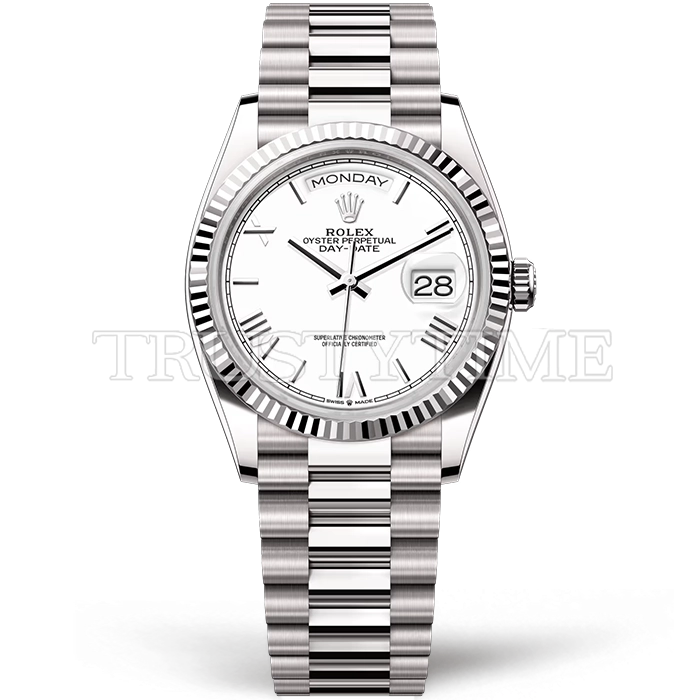 Часы Rolex из коллекции Day-Date. Классические женские часы Rolex Day-Date 36mm 128239-0059 премиального качества (Артикул магазина: RX-3447) оснащены надежным автоматическим механизмом с автоподзаводом (работает от амплитуды движения руки) калибра 3255, в котором реализованы следующие функции: часовая, минутная и секундная стрелки, а так же дата, день недели. Круглый корпус часов стального цвета, имеющий размер 36 мм и высоту 12 мм превосходно дополнит образ и украсит запястье своего обладателя. Для изготовления часов Rolex Day-Date 36mm 128239-0059 предлагаемых в нашем интернет-магазине, применяются нержавеющая сталь 904 высокого качества (Швейцарский стандарт), а так же сапфировое стекло высокой прочности, благодаря чему обеспечивается максимальная защита от сколов и механических повреждений. Отличительной чертой данной модели является белый циферблат, часовые индексы которого обеспечивают римские цифры. Завершает образ браслет из нержавеющей стали стального цвета с фирменной раскладывающейся застежкой Rolex. Водонепроницаемость данной модели составляет 30М (WR30) – допускается минимальное воздействие с водой.