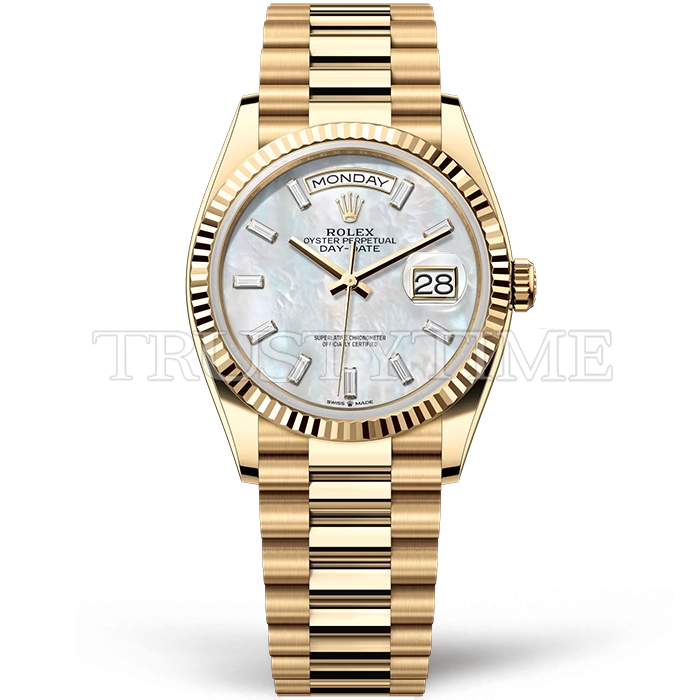Часы Rolex из коллекции Day-Date. Классические женские часы Rolex Day-Date 36mm 128238-0123 премиального качества (Артикул магазина: RX-3478) оснащены надежным автоматическим механизмом с автоподзаводом (работает от амплитуды движения руки) калибра 3255, в котором реализованы следующие функции: часовая, минутная и секундная стрелки, а так же дата, день недели. Круглый корпус часов цветы желтой золота, имеющий размер 36 мм и высоту 12 мм превосходно дополнит образ и украсит запястье своего обладателя. Для изготовления часов Rolex Day-Date 36mm 128238-0123 предлагаемых в нашем интернет-магазине, применяются нержавеющая сталь 904 высокого качества (Швейцарский стандарт), а так же сапфировое стекло высокой прочности, благодаря чему обеспечивается максимальная защита от сколов и механических повреждений. Отличительной чертой данной модели является перламутровый циферблат, часовые индексы которого обеспечивают камни. Завершает образ браслет из нержавеющей стали цвета желтого золота с фирменной раскладывающейся застежкой Rolex. Водонепроницаемость данной модели составляет 30М (WR30) – допускается минимальное воздействие с водой.
