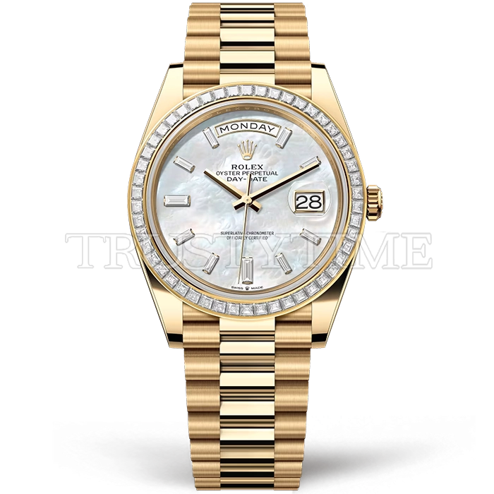 Часы Rolex из коллекции Day-Date. Классические мужские часы Rolex Day-Date 40mm 228398TBR-0043 премиального качества (Артикул магазина: RX-3601) оснащены надежным автоматическим механизмом с автоподзаводом (работает от амплитуды движения руки) калибра 3255, в котором реализованы следующие функции: часовая, минутная и секундная стрелки, а так же дата, день недели. Круглый корпус часов стального цвета, имеющий размер 40 мм и высоту 12 мм превосходно дополнит образ и украсит запястье своего обладателя. Для изготовления часов Rolex Day-Date 40mm 228398TBR-0043 предлагаемых в нашем интернет-магазине, применяются нержавеющая сталь 904 высокого качества (Швейцарский стандарт), а так же сапфировое стекло высокой прочности, благодаря чему обеспечивается максимальная защита от сколов и механических повреждений. Отличительной чертой данной модели является перламутровый циферблат, часовые индексы которого обеспечивают камни. Завершает образ браслет из нержавеющей стали цвета желтого золота с фирменной раскладывающейся застежкой Rolex. Водонепроницаемость данной модели составляет 30М (WR30) – допускается минимальное воздействие с водой.