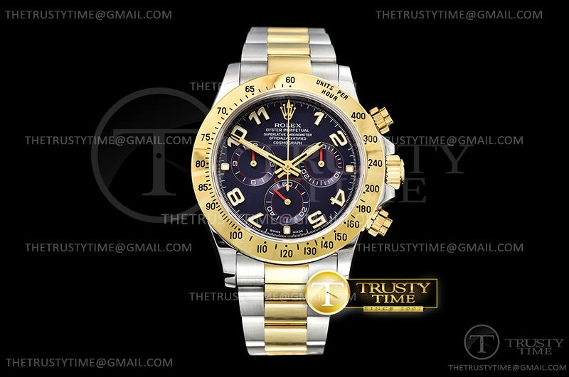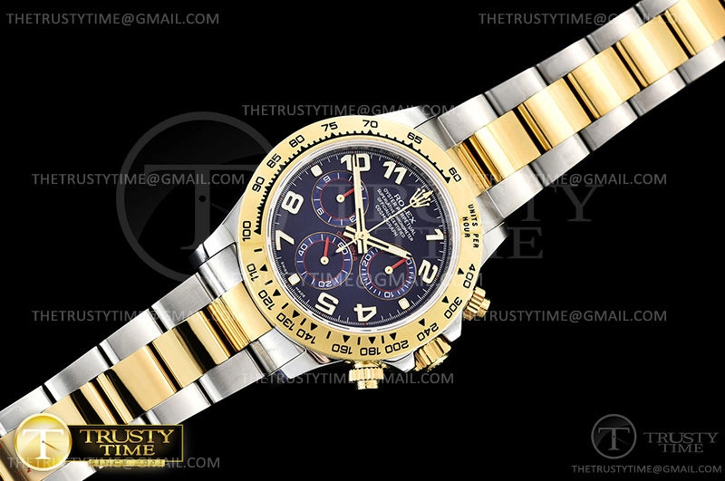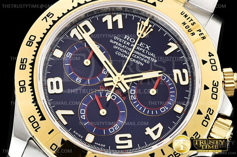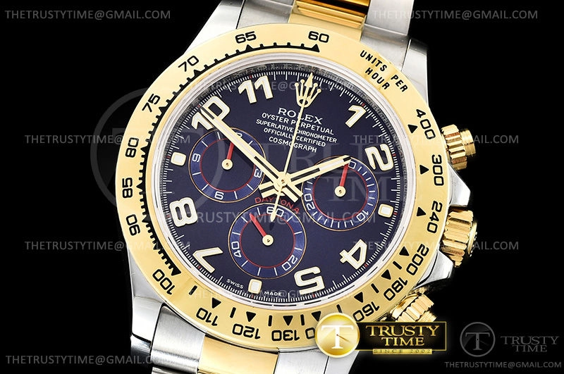 Часы Rolex из коллекции Daytona. Спортивные мужские часы Rolex Cosmograph Daytona 116523-0045 премиального качества (Артикул магазина: RX-1157) оснащены надежным автоматическим механизмом с автоподзаводом (работает от амплитуды движения руки) калибра 4130, в котором реализованы следующие функции: часовая, минутная и секундная стрелки, а так же хронограф. Круглый корпус часов комбинированного сталь с желтого золота цвета, имеющий размер 40 мм и высоту 12.5 мм превосходно дополнит образ и украсит запястье своего обладателя. Для изготовления часов Rolex Cosmograph Daytona 116523-0045 предлагаемых в нашем интернет-магазине, применяются нержавеющая сталь 316L высокого качества (Швейцарский стандарт), а так же сапфировое стекло высокой прочности, благодаря чему обеспечивается максимальная защита от сколов и механических повреждений. Отличительной чертой данной модели является синий циферблат, часовые индексы которого обеспечивают арабские цифры. Завершает образ браслет из нержавеющей стали комбинированного сталь с желтым золотом цвета с фирменной раскладывающейся застежкой Rolex. Водонепроницаемость данной модели составляет 100М (WR100) – в таких часах можно плавать и нырять без акваланга в морской и пресной воде, а также заниматься водными видами спорта.
