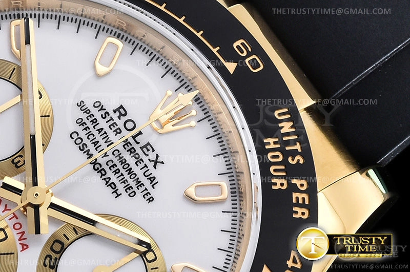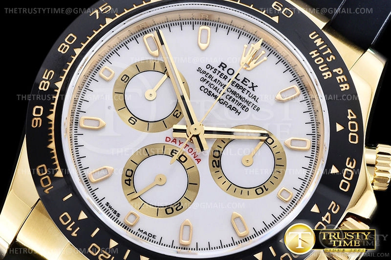 Часы Rolex из коллекции Daytona. Спортивные мужские часы Rolex Cosmograph Daytona 116518LN-0041 премиального качества (Артикул магазина: RX-1075) оснащены надежным автоматическим механизмом с автоподзаводом (работает от амплитуды движения руки) калибра 4130, в котором реализованы следующие функции: часовая, минутная и секундная стрелки, а так же хронограф. Круглый корпус часов цветы желтой золота, имеющий размер 40 мм и высоту 12.5 мм превосходно дополнит образ и украсит запястье своего обладателя. Для изготовления часов Rolex Cosmograph Daytona 116518LN-0041 предлагаемых в нашем интернет-магазине, применяются нержавеющая сталь 904L высокого качества (Швейцарский стандарт), а так же сапфировое стекло высокой прочности, благодаря чему обеспечивается максимальная защита от сколов и механических повреждений. Отличительной чертой данной модели является белый циферблат, часовые индексы которого обеспечивают часовые метки. Завершает образ каучуковый ремешок черного цвета с фирменной раскладывающейся застежкой Rolex. Водонепроницаемость данной модели составляет 100М (WR100) – в таких часах можно плавать и нырять без акваланга в морской и пресной воде, а также заниматься водными видами спорта.