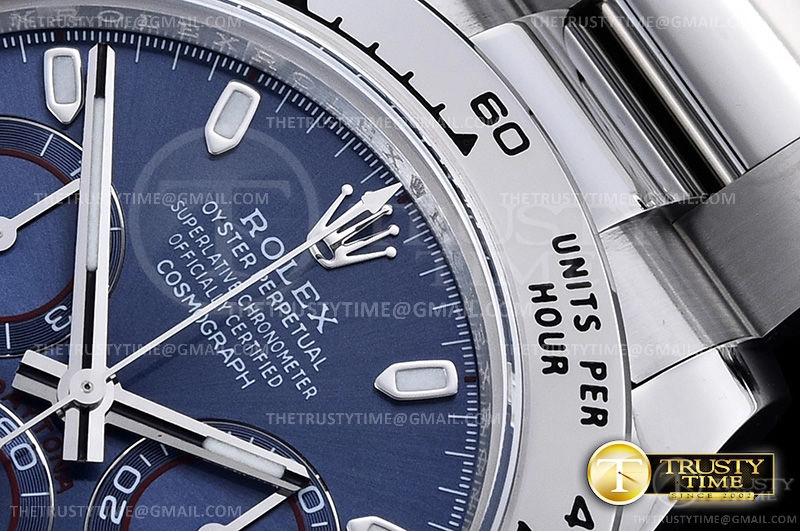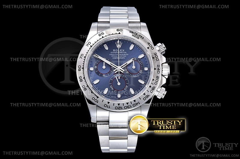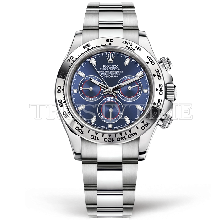 Часы Rolex из коллекции Daytona. Спортивные мужские часы Rolex Cosmograph Daytona 116509-0071 премиального качества (Артикул магазина: RX-1072) оснащены надежным автоматическим механизмом с автоподзаводом (работает от амплитуды движения руки) калибра 4130, в котором реализованы следующие функции: часовая, минутная и секундная стрелки, а так же хронограф. Круглый корпус часов стального цвета, имеющий размер 40 мм и высоту 12.5 мм превосходно дополнит образ и украсит запястье своего обладателя. Для изготовления часов Rolex Cosmograph Daytona 116509-0071 предлагаемых в нашем интернет-магазине, применяются нержавеющая сталь 904L высокого качества (Швейцарский стандарт), а так же сапфировое стекло высокой прочности, благодаря чему обеспечивается максимальная защита от сколов и механических повреждений. Отличительной чертой данной модели является синий циферблат, часовые индексы которого обеспечивают часовые метки. Завершает образ браслет из нержавеющей стали стального цвета с фирменной раскладывающейся застежкой Rolex. Водонепроницаемость данной модели составляет 100М (WR100) – в таких часах можно плавать и нырять без акваланга в морской и пресной воде, а также заниматься водными видами спорта.