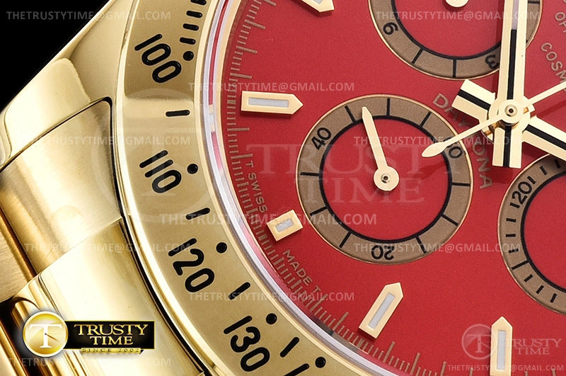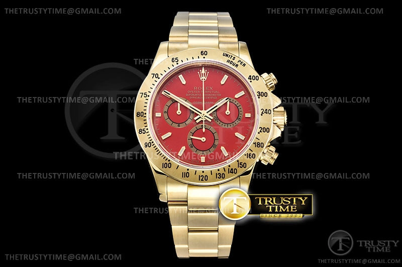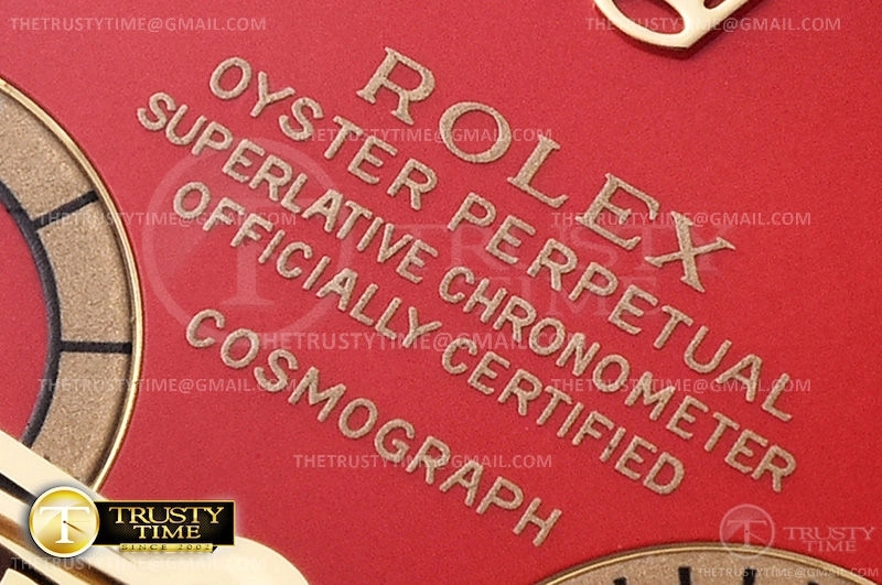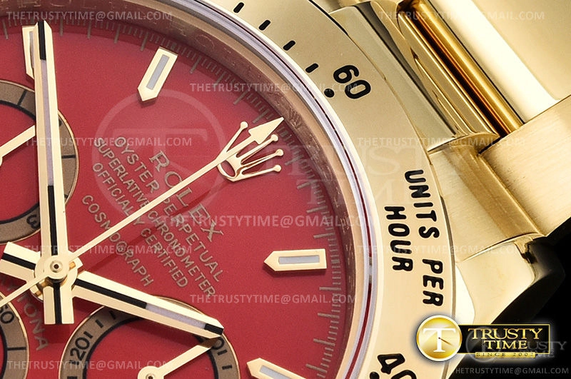 Часы Rolex из коллекции Daytona. Спортивные мужские часы Rolex Cosmograph Daytona 116508LN премиального качества (Артикул магазина: RX-1069) оснащены надежным автоматическим механизмом с автоподзаводом (работает от амплитуды движения руки) калибра 4130, в котором реализованы следующие функции: часовая, минутная и секундная стрелки, а так же хронограф. Круглый корпус часов цветы желтой золота, имеющий размер 40 мм и высоту 12.5 мм превосходно дополнит образ и украсит запястье своего обладателя. Для изготовления часов Rolex Cosmograph Daytona 116508LN предлагаемых в нашем интернет-магазине, применяются нержавеющая сталь 316F высокого качества (Швейцарский стандарт), а так же сапфировое стекло высокой прочности, благодаря чему обеспечивается максимальная защита от сколов и механических повреждений. Отличительной чертой данной модели является красный циферблат, часовые индексы которого обеспечивают часовые метки. Завершает образ браслет из нержавеющей стали цвета желтого золота с фирменной раскладывающейся застежкой Rolex. Водонепроницаемость данной модели составляет 100М (WR100) – в таких часах можно плавать и нырять без акваланга в морской и пресной воде, а также заниматься водными видами спорта.
