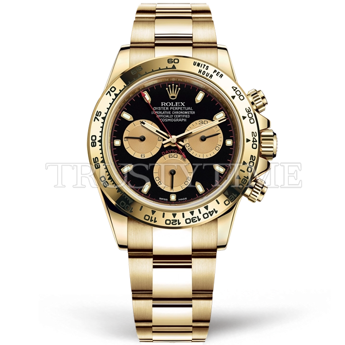 Часы Rolex из коллекции Daytona. Спортивные мужские часы Rolex Cosmograph Daytona 116508-0009 премиального качества (Артикул магазина: RX-1305) оснащены надежным автоматическим механизмом с автоподзаводом (работает от амплитуды движения руки) калибра 4130, в котором реализованы следующие функции: часовая, минутная и секундная стрелки, а так же хронограф. Круглый корпус часов цветы желтой золота, имеющий размер 40 мм и высоту 12.5 мм превосходно дополнит образ и украсит запястье своего обладателя. Для изготовления часов Rolex Cosmograph Daytona 116508-0009 предлагаемых в нашем интернет-магазине, применяются нержавеющая сталь 904L высокого качества (Швейцарский стандарт), а так же сапфировое стекло высокой прочности, благодаря чему обеспечивается максимальная защита от сколов и механических повреждений. Отличительной чертой данной модели является черный циферблат, часовые индексы которого обеспечивают часовые метки. Завершает образ браслет из нержавеющей стали цвета желтого золота с фирменной раскладывающейся застежкой Rolex. Водонепроницаемость данной модели составляет 100М (WR100) – в таких часах можно плавать и нырять без акваланга в морской и пресной воде, а также заниматься водными видами спорта.