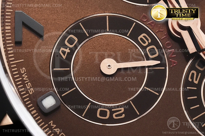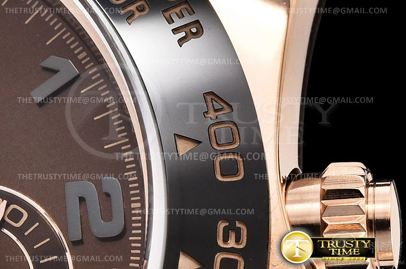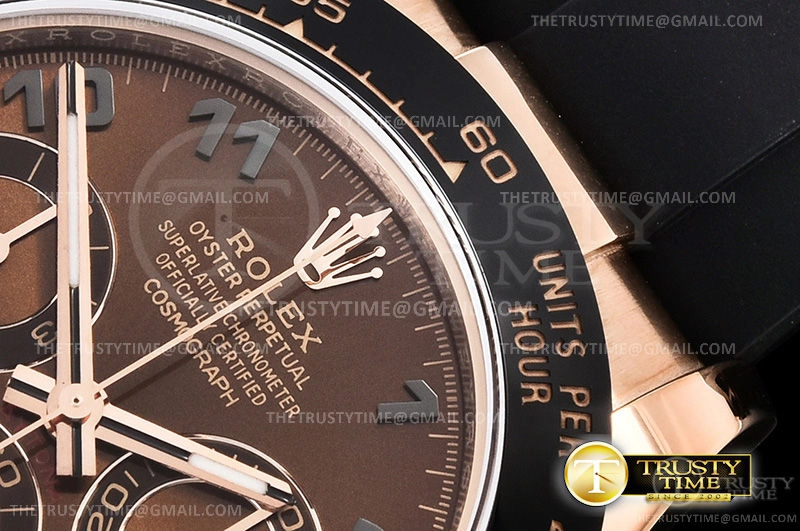 Часы Rolex из коллекции Daytona. Спортивные мужские часы Rolex Cosmograph Daytona 116515LN-0055 премиального качества (Артикул магазина: RX-1053) оснащены надежным автоматическим механизмом с автоподзаводом (работает от амплитуды движения руки) калибра 4130, в котором реализованы следующие функции: часовая, минутная и секундная стрелки, а так же хронограф. Круглый корпус часов розового цвета, имеющий размер 40 мм и высоту 12.5 мм превосходно дополнит образ и украсит запястье своего обладателя. Для изготовления часов Rolex Cosmograph Daytona 116515LN-0055 предлагаемых в нашем интернет-магазине, применяются нержавеющая сталь 904L высокого качества (Швейцарский стандарт), а так же сапфировое стекло высокой прочности, благодаря чему обеспечивается максимальная защита от сколов и механических повреждений. Отличительной чертой данной модели является коричневый циферблат, часовые индексы которого обеспечивают арабские цифры. Завершает образ каучуковый ремешок черного цвета с фирменной раскладывающейся застежкой Rolex. Водонепроницаемость данной модели составляет 100М (WR100) – в таких часах можно плавать и нырять без акваланга в морской и пресной воде, а также заниматься водными видами спорта.