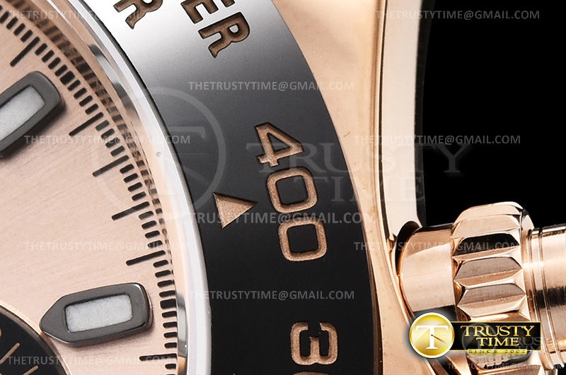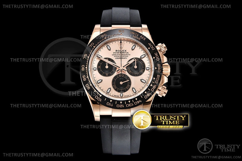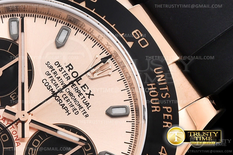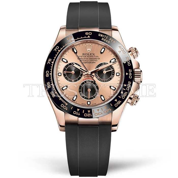 Часы Rolex из коллекции Daytona. Спортивные мужские часы Rolex Cosmograph Daytona 116515LN-0018 премиального качества (Артикул магазина: RX-1051) оснащены надежным автоматическим механизмом с автоподзаводом (работает от амплитуды движения руки) калибра 4130, в котором реализованы следующие функции: часовая, минутная и секундная стрелки, а так же хронограф. Круглый корпус часов розового цвета, имеющий размер 40 мм и высоту 12.5 мм превосходно дополнит образ и украсит запястье своего обладателя. Для изготовления часов Rolex Cosmograph Daytona 116515LN-0018 предлагаемых в нашем интернет-магазине, применяются нержавеющая сталь 904L высокого качества (Швейцарский стандарт), а так же сапфировое стекло высокой прочности, благодаря чему обеспечивается максимальная защита от сколов и механических повреждений. Отличительной чертой данной модели является золотой циферблат, часовые индексы которого обеспечивают часовые метки. Завершает образ каучуковый ремешок черного цвета с фирменной раскладывающейся застежкой Rolex. Водонепроницаемость данной модели составляет 100М (WR100) – в таких часах можно плавать и нырять без акваланга в морской и пресной воде, а также заниматься водными видами спорта.