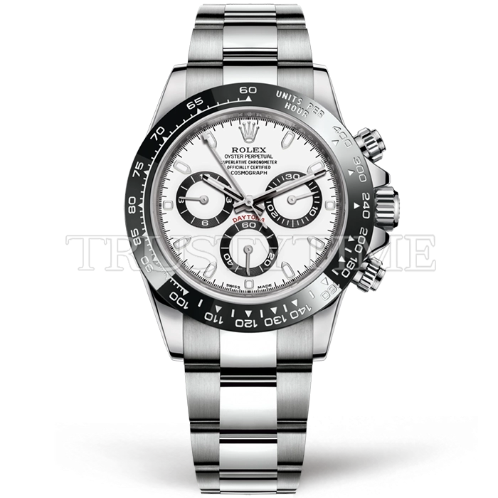 Часы Rolex из коллекции Daytona. Спортивные мужские часы Rolex Cosmograph Daytona 116500LN-0001 премиального качества (Артикул магазина: RX-1674) оснащены надежным автоматическим механизмом с автоподзаводом (работает от амплитуды движения руки) калибра 4130, в котором реализованы следующие функции: часовая, минутная и секундная стрелки, а так же хронограф. Круглый корпус часов стального цвета, имеющий размер 40 мм и высоту 12.5 мм превосходно дополнит образ и украсит запястье своего обладателя. Для изготовления часов Rolex Cosmograph Daytona 116500LN-0001 предлагаемых в нашем интернет-магазине, применяются нержавеющая сталь 904L высокого качества (Швейцарский стандарт), а так же сапфировое стекло высокой прочности, благодаря чему обеспечивается максимальная защита от сколов и механических повреждений. Отличительной чертой данной модели является белый циферблат, часовые индексы которого обеспечивают часовые метки. Завершает образ браслет из нержавеющей стали стального цвета с фирменной раскладывающейся застежкой Rolex. Водонепроницаемость данной модели составляет 100М (WR100) – в таких часах можно плавать и нырять без акваланга в морской и пресной воде, а также заниматься водными видами спорта.