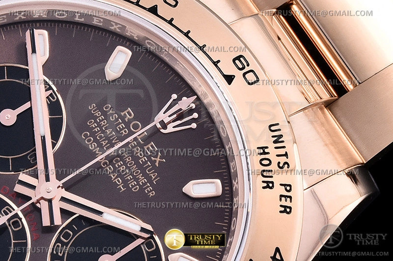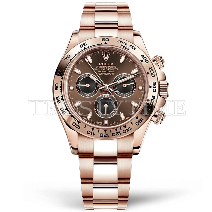 Часы Rolex из коллекции Daytona. Спортивные мужские часы Rolex Cosmograph Daytona 116505-0013 премиального качества (Артикул магазина: RX-1820) оснащены надежным автоматическим механизмом с автоподзаводом (работает от амплитуды движения руки) калибра 4130, в котором реализованы следующие функции: часовая, минутная и секундная стрелки, а так же хронограф. Круглый корпус часов розового цвета, имеющий размер 40 мм и высоту 12.5 мм превосходно дополнит образ и украсит запястье своего обладателя. Для изготовления часов Rolex Cosmograph Daytona 116505-0013 предлагаемых в нашем интернет-магазине, применяются нержавеющая сталь 904L высокого качества (Швейцарский стандарт), а так же сапфировое стекло высокой прочности, благодаря чему обеспечивается максимальная защита от сколов и механических повреждений. Отличительной чертой данной модели является коричневый циферблат, часовые индексы которого обеспечивают часовые метки. Завершает образ браслет из нержавеющей стали цвета розового золота с фирменной раскладывающейся застежкой Rolex. Водонепроницаемость данной модели составляет 100М (WR100) – в таких часах можно плавать и нырять без акваланга в морской и пресной воде, а также заниматься водными видами спорта.