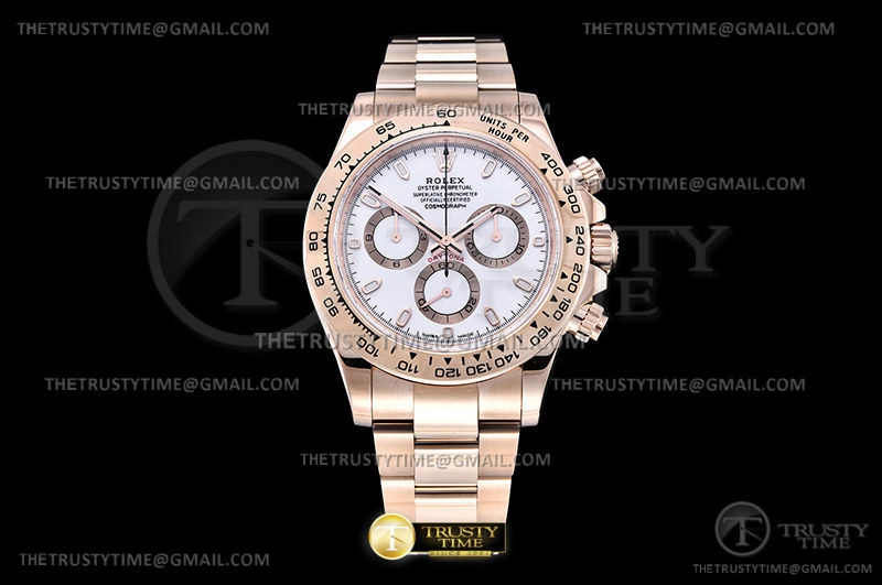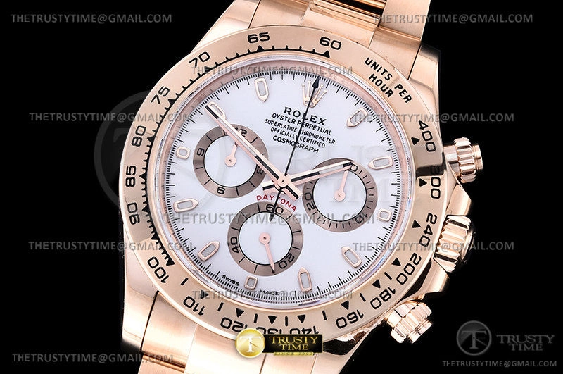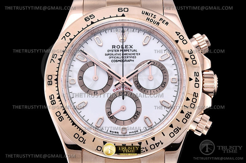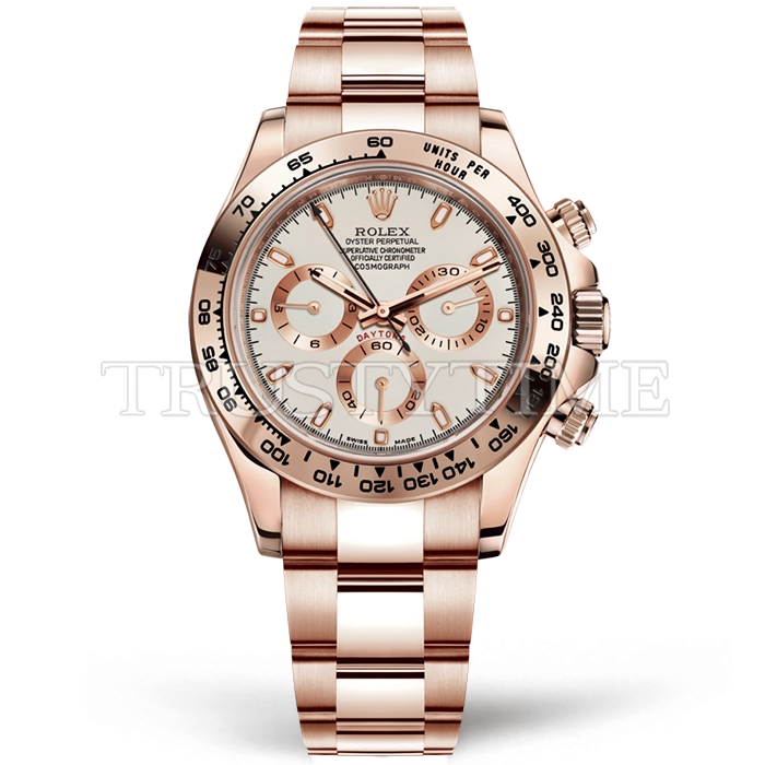 Часы Rolex из коллекции Daytona. Спортивные мужские часы Rolex Cosmograph Daytona 116505-0010 премиального качества (Артикул магазина: RX-1822) оснащены надежным автоматическим механизмом с автоподзаводом (работает от амплитуды движения руки) калибра 4130, в котором реализованы следующие функции: часовая, минутная и секундная стрелки, а так же хронограф. Круглый корпус часов розового цвета, имеющий размер 40 мм и высоту 12.5 мм превосходно дополнит образ и украсит запястье своего обладателя. Для изготовления часов Rolex Cosmograph Daytona 116505-0010 предлагаемых в нашем интернет-магазине, применяются нержавеющая сталь 904L высокого качества (Швейцарский стандарт), а так же сапфировое стекло высокой прочности, благодаря чему обеспечивается максимальная защита от сколов и механических повреждений. Отличительной чертой данной модели является белый циферблат, часовые индексы которого обеспечивают часовые метки. Завершает образ браслет из нержавеющей стали цвета розового золота с фирменной раскладывающейся застежкой Rolex. Водонепроницаемость данной модели составляет 100М (WR100) – в таких часах можно плавать и нырять без акваланга в морской и пресной воде, а также заниматься водными видами спорта.