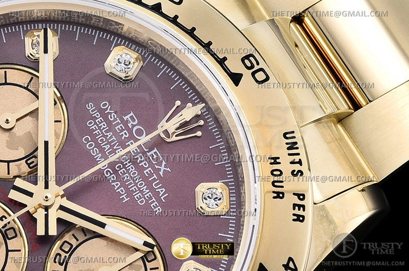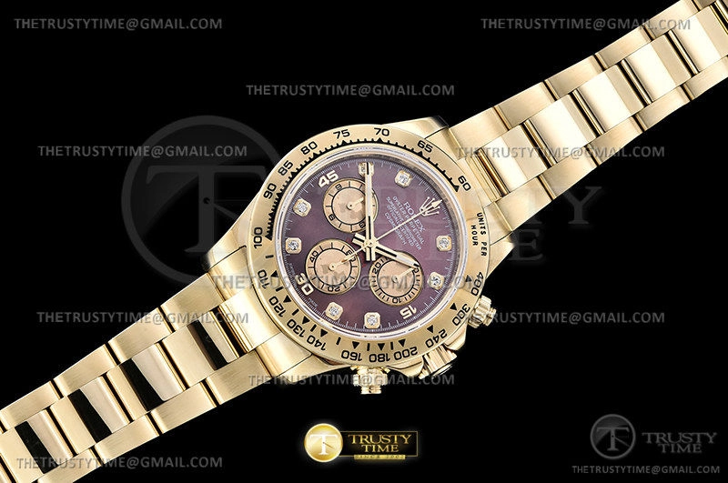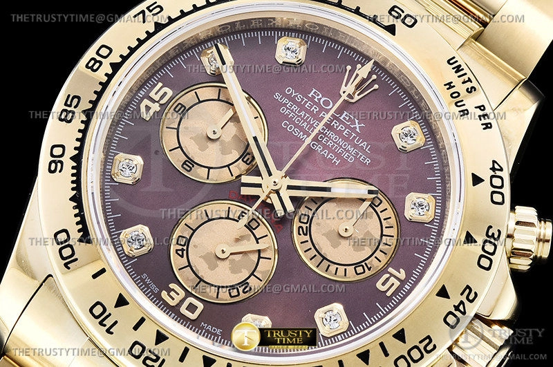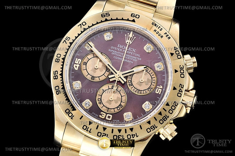 Часы Rolex из коллекции Daytona. Спортивные мужские часы Rolex Cosmograph Daytona 116508-0011 премиального качества (Артикул магазина: RX-1839) оснащены надежным автоматическим механизмом с автоподзаводом (работает от амплитуды движения руки) калибра 4130, в котором реализованы следующие функции: часовая, минутная и секундная стрелки, а так же хронограф. Круглый корпус часов цветы желтой золота, имеющий размер 40 мм и высоту 12.5 мм превосходно дополнит образ и украсит запястье своего обладателя. Для изготовления часов Rolex Cosmograph Daytona 116508-0011 предлагаемых в нашем интернет-магазине, применяются нержавеющая сталь 904L высокого качества (Швейцарский стандарт), а так же сапфировое стекло высокой прочности, благодаря чему обеспечивается максимальная защита от сколов и механических повреждений. Отличительной чертой данной модели является коричневый циферблат, часовые индексы которого обеспечивают камни. Завершает образ браслет из нержавеющей стали цвета желтого золота с фирменной раскладывающейся застежкой Rolex. Водонепроницаемость данной модели составляет 100М (WR100) – в таких часах можно плавать и нырять без акваланга в морской и пресной воде, а также заниматься водными видами спорта.
