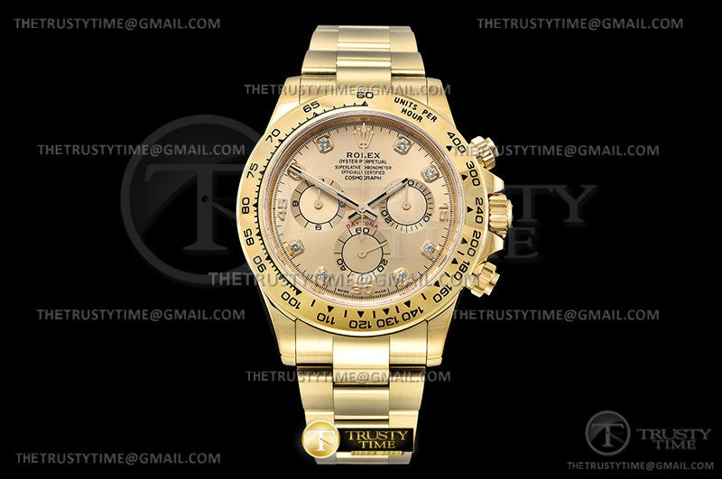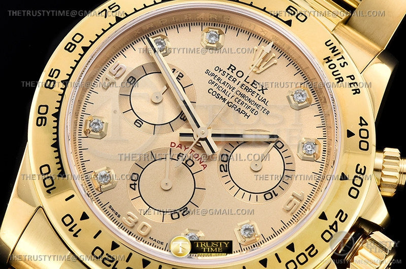 Часы Rolex из коллекции Daytona. Спортивные мужские часы Rolex Cosmograph Daytona 116508-0006 премиального качества (Артикул магазина: RX-1872) оснащены надежным автоматическим механизмом с автоподзаводом (работает от амплитуды движения руки) калибра 4130, в котором реализованы следующие функции: часовая, минутная и секундная стрелки, а так же хронограф. Круглый корпус часов цветы желтой золота, имеющий размер 40 мм и высоту 12.5 мм превосходно дополнит образ и украсит запястье своего обладателя. Для изготовления часов Rolex Cosmograph Daytona 116508-0006 предлагаемых в нашем интернет-магазине, применяются нержавеющая сталь 904L высокого качества (Швейцарский стандарт), а так же сапфировое стекло высокой прочности, благодаря чему обеспечивается максимальная защита от сколов и механических повреждений. Отличительной чертой данной модели является золотой циферблат, часовые индексы которого обеспечивают камни. Завершает образ браслет из нержавеющей стали цвета желтого золота с фирменной раскладывающейся застежкой Rolex. Водонепроницаемость данной модели составляет 100М (WR100) – в таких часах можно плавать и нырять без акваланга в морской и пресной воде, а также заниматься водными видами спорта.