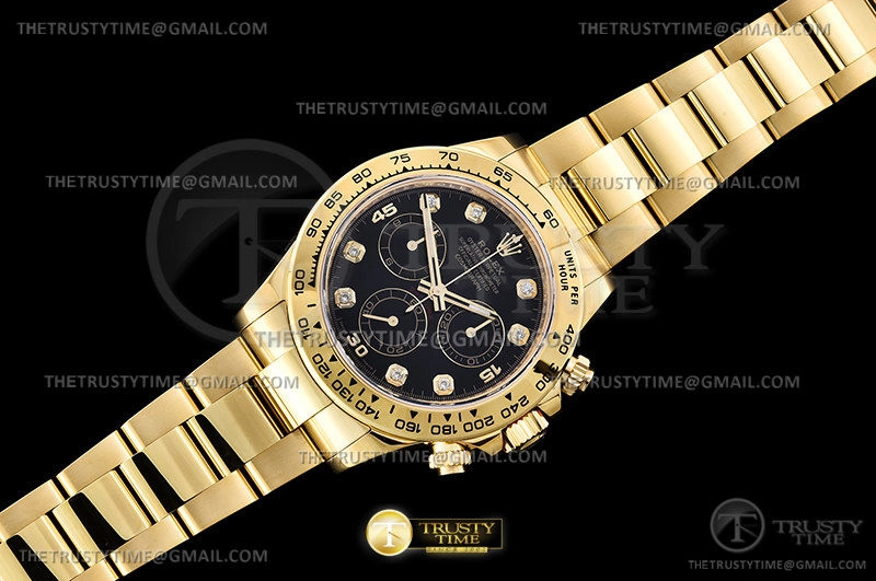 Часы Rolex из коллекции Daytona. Спортивные мужские часы Rolex Cosmograph Daytona 116508-0008 премиального качества (Артикул магазина: RX-1873) оснащены надежным автоматическим механизмом с автоподзаводом (работает от амплитуды движения руки) калибра 4130, в котором реализованы следующие функции: часовая, минутная и секундная стрелки, а так же хронограф. Круглый корпус часов цветы желтой золота, имеющий размер 40 мм и высоту 12.5 мм превосходно дополнит образ и украсит запястье своего обладателя. Для изготовления часов Rolex Cosmograph Daytona 116508-0008 предлагаемых в нашем интернет-магазине, применяются нержавеющая сталь 904L высокого качества (Швейцарский стандарт), а так же сапфировое стекло высокой прочности, благодаря чему обеспечивается максимальная защита от сколов и механических повреждений. Отличительной чертой данной модели является черный циферблат, часовые индексы которого обеспечивают камни. Завершает образ браслет из нержавеющей стали цвета желтого золота с фирменной раскладывающейся застежкой Rolex. Водонепроницаемость данной модели составляет 100М (WR100) – в таких часах можно плавать и нырять без акваланга в морской и пресной воде, а также заниматься водными видами спорта.