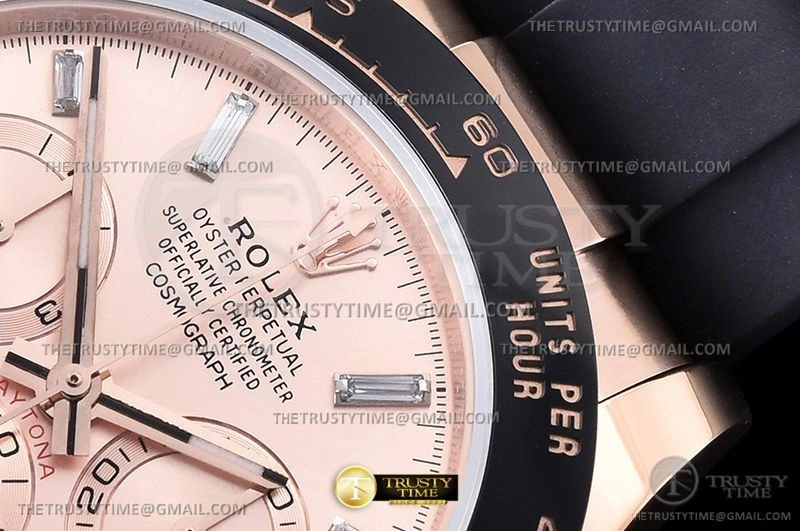 Часы Rolex из коллекции Daytona. Спортивные мужские часы Rolex Cosmograph Daytona 116515LN-0021 премиального качества (Артикул магазина: RX-2262) оснащены надежным автоматическим механизмом с автоподзаводом (работает от амплитуды движения руки) калибра 4130, в котором реализованы следующие функции: часовая, минутная и секундная стрелки, а так же хронограф. Круглый корпус часов розового цвета, имеющий размер 40 мм и высоту 12.5 мм превосходно дополнит образ и украсит запястье своего обладателя. Для изготовления часов Rolex Cosmograph Daytona 116515LN-0021 предлагаемых в нашем интернет-магазине, применяются нержавеющая сталь 904L высокого качества (Швейцарский стандарт), а так же сапфировое стекло высокой прочности, благодаря чему обеспечивается максимальная защита от сколов и механических повреждений. Отличительной чертой данной модели является золотой циферблат, часовые индексы которого обеспечивают камни. Завершает образ каучуковый ремешок черного цвета с фирменной раскладывающейся застежкой Rolex. Водонепроницаемость данной модели составляет 100М (WR100) – в таких часах можно плавать и нырять без акваланга в морской и пресной воде, а также заниматься водными видами спорта.