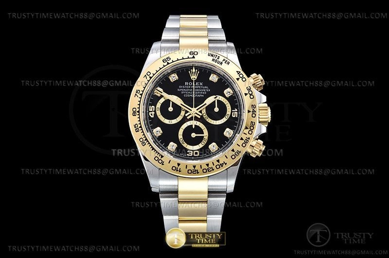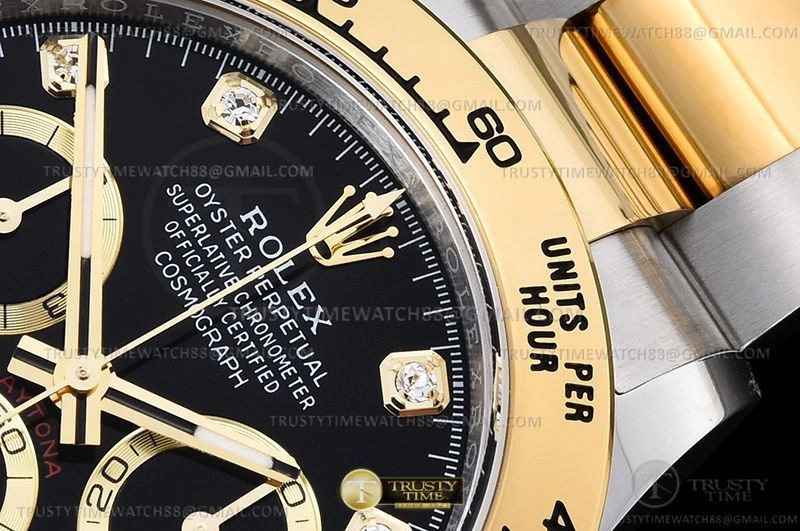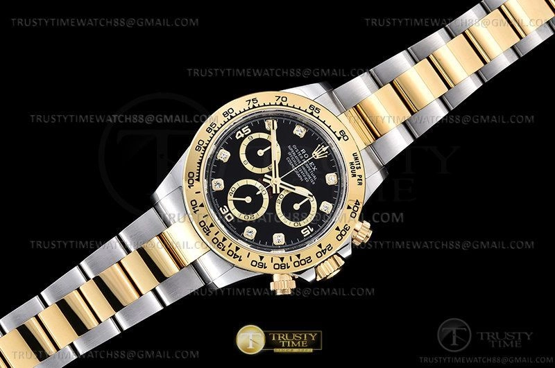 Часы Rolex из коллекции Daytona. Спортивные мужские часы Rolex Cosmograph Daytona 116503-0011 премиального качества (Артикул магазина: RX-2329) оснащены надежным автоматическим механизмом с автоподзаводом (работает от амплитуды движения руки) калибра 4130, в котором реализованы следующие функции: часовая, минутная и секундная стрелки, а так же хронограф. Круглый корпус часов комбинированного сталь с желтого золота цвета, имеющий размер 40 мм и высоту 12.5 мм превосходно дополнит образ и украсит запястье своего обладателя. Для изготовления часов Rolex Cosmograph Daytona 116503-0011 предлагаемых в нашем интернет-магазине, применяются нержавеющая сталь 904L высокого качества (Швейцарский стандарт), а так же сапфировое стекло высокой прочности, благодаря чему обеспечивается максимальная защита от сколов и механических повреждений. Отличительной чертой данной модели является черный циферблат, часовые индексы которого обеспечивают камни. Завершает образ браслет из нержавеющей стали комбинированного сталь с желтым золотом цвета с фирменной раскладывающейся застежкой Rolex. Водонепроницаемость данной модели составляет 100М (WR100) – в таких часах можно плавать и нырять без акваланга в морской и пресной воде, а также заниматься водными видами спорта.