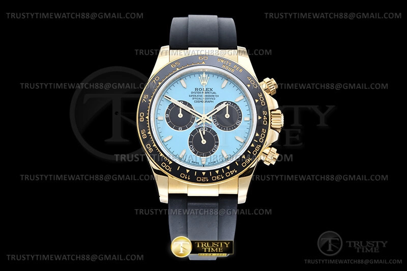 Часы Rolex из коллекции Daytona. Спортивные мужские часы Rolex Cosmograph Daytona 126518LN-0014 премиального качества (Артикул магазина: RX-3533) оснащены надежным автоматическим механизмом с автоподзаводом (работает от амплитуды движения руки) калибра 4131, в котором реализованы следующие функции: часовая, минутная и секундная стрелки, а так же хронограф. Круглый корпус часов цветы желтой золота, имеющий размер 40 мм и высоту 12 мм превосходно дополнит образ и украсит запястье своего обладателя. Для изготовления часов Rolex Cosmograph Daytona 126518LN-0014 предлагаемых в нашем интернет-магазине, применяются нержавеющая сталь 904L высокого качества (Швейцарский стандарт), а так же сапфировое стекло высокой прочности, благодаря чему обеспечивается максимальная защита от сколов и механических повреждений. Отличительной чертой данной модели является голубой циферблат, часовые индексы которого обеспечивают камни. Завершает образ каучуковый ремешок черного цвета с фирменной раскладывающейся застежкой Rolex. Водонепроницаемость данной модели составляет 100М (WR100) – в таких часах можно плавать и нырять без акваланга в морской и пресной воде, а также заниматься водными видами спорта.
