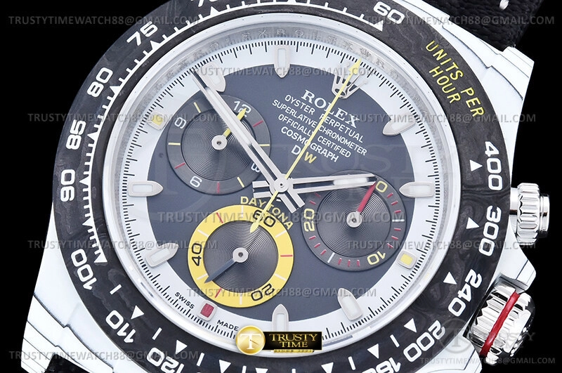 Часы Rolex из коллекции Daytona DIW. Спортивные мужские часы Rolex Cosmograph Daytona DIW Quantum Racer премиального качества (Артикул магазина: RX-3562) оснащены надежным автоматическим механизмом с автоподзаводом (работает от амплитуды движения руки) калибра 4130, в котором реализованы следующие функции: часовая, минутная и секундная стрелки, а так же хронограф. Круглый корпус часов черного цвета, имеющий размер 40 мм и высоту 12.5 мм превосходно дополнит образ и украсит запястье своего обладателя. Для изготовления часов Rolex Cosmograph Daytona DIW Quantum Racer предлагаемых в нашем интернет-магазине, применяются кованый карбон высокого качества (Швейцарский стандарт), а так же сапфировое стекло высокой прочности, благодаря чему обеспечивается максимальная защита от сколов и механических повреждений. Отличительной чертой данной модели является серый циферблат, часовые индексы которого обеспечивают часовые метки. Завершает образ нейлоновый ремешок черного цвета на липучке Rolex. Водонепроницаемость данной модели составляет 30М (WR30) – допускается минимальное воздействие с водой.